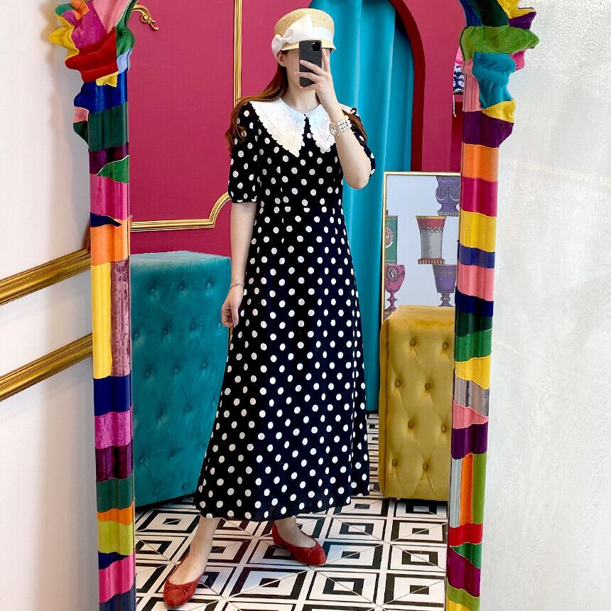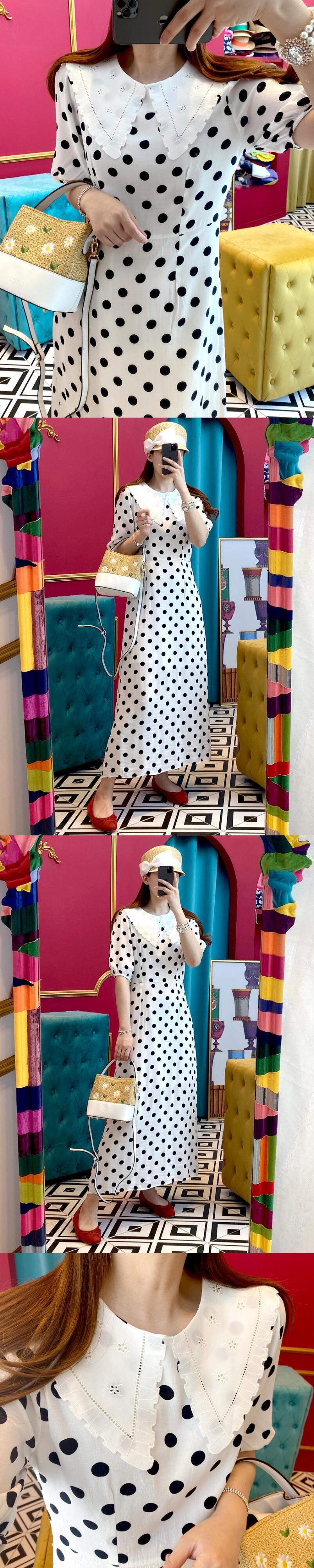 夏のシックなニッチラペルステッチ中空レースは薄いハイウエストの黒と白の水玉模様のドレスロングスカートの女性でした 韓国婦人14835000222