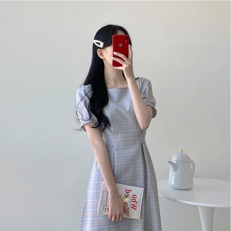 スタンダード格子柄ドレス ウェストAラインスカート レトロ フラワーデザイン 韓国婦人80225741225