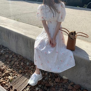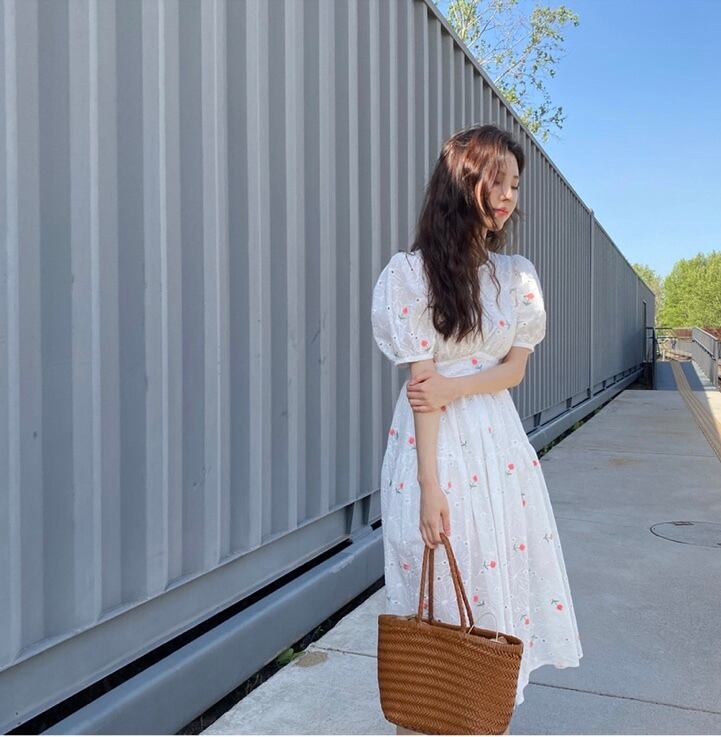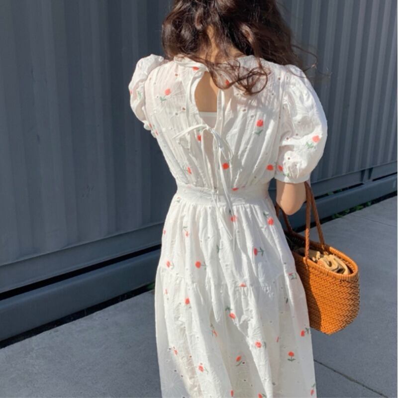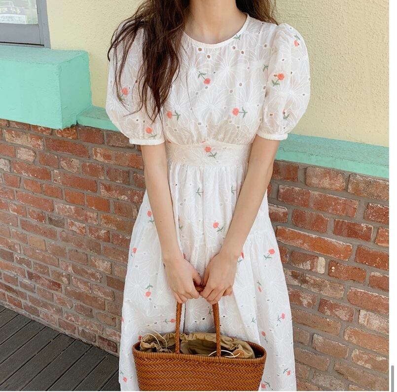 夏の新しいスタイルのシックな刺繡ミドル丈ラウンドネックピーチブロッサムホロースウィートとフェアリーニッチドレス女性 韓国婦人71578370279