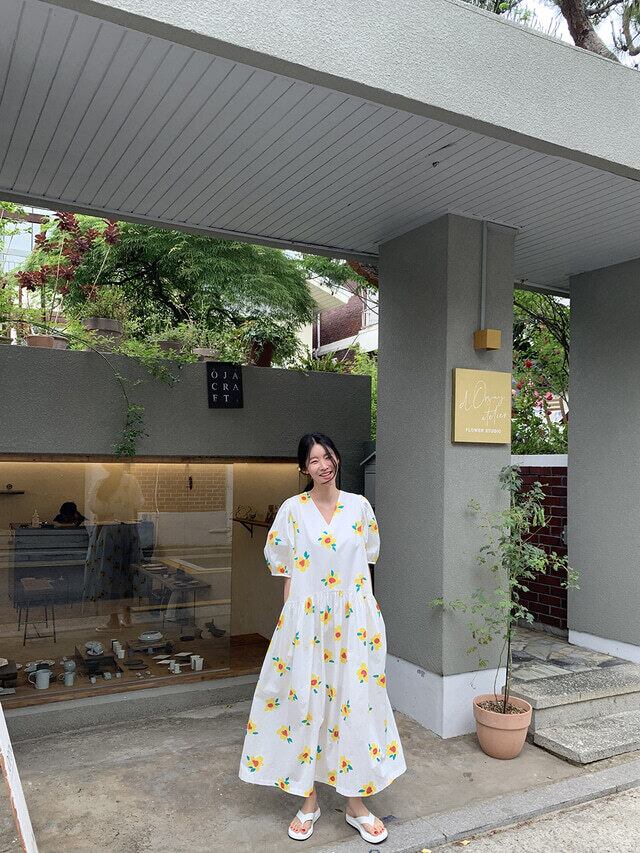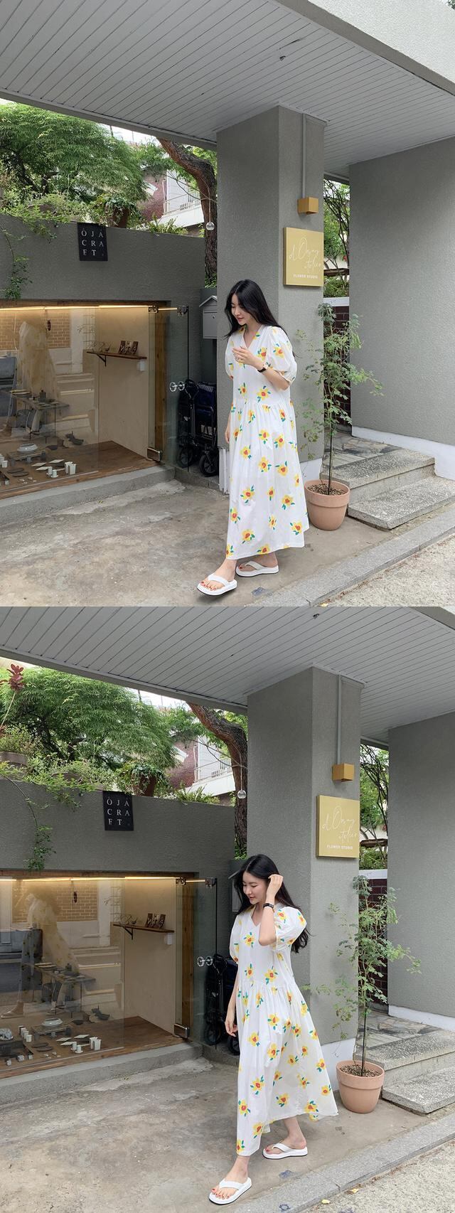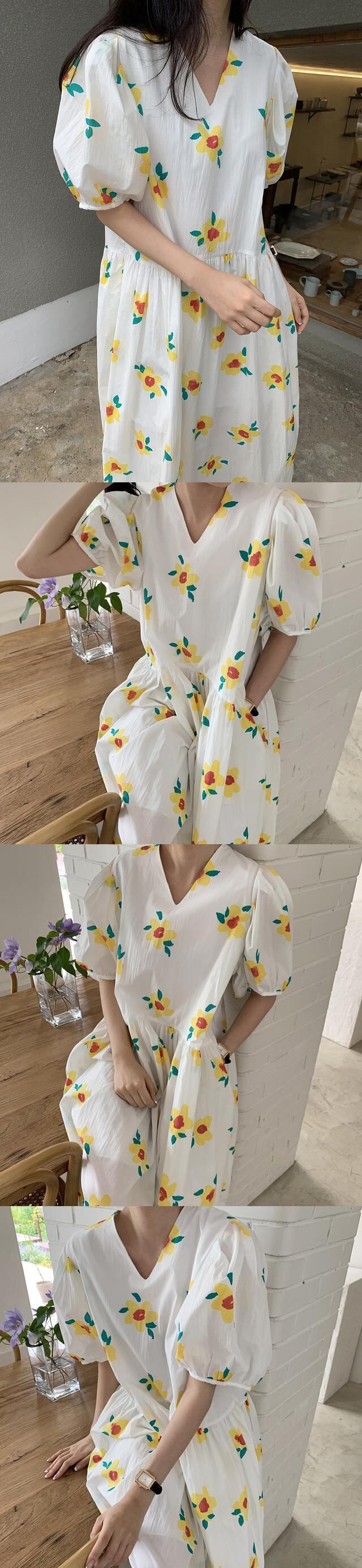 シックなロマンティックシーズンウエスタンスタイルは細いVネックルーズフォールドハイウエストパフスリーブフローラルドレスロングスカート 韓国婦人57653395414