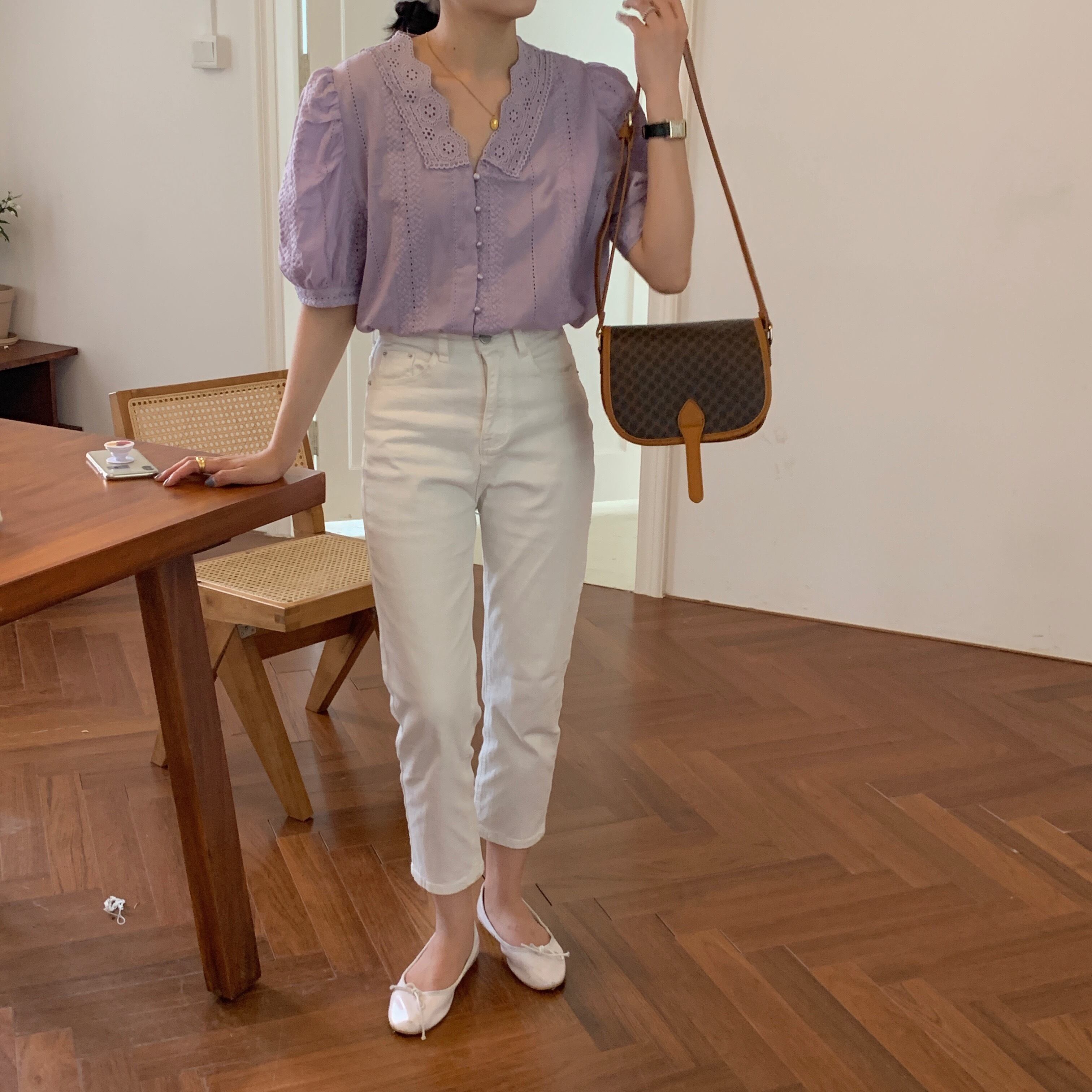 2020年夏のデザインニッチフレンチVネックレース無地ルーズウエスタンスタイルシャツ中空レースブラウス女性 韓国婦人74469570245