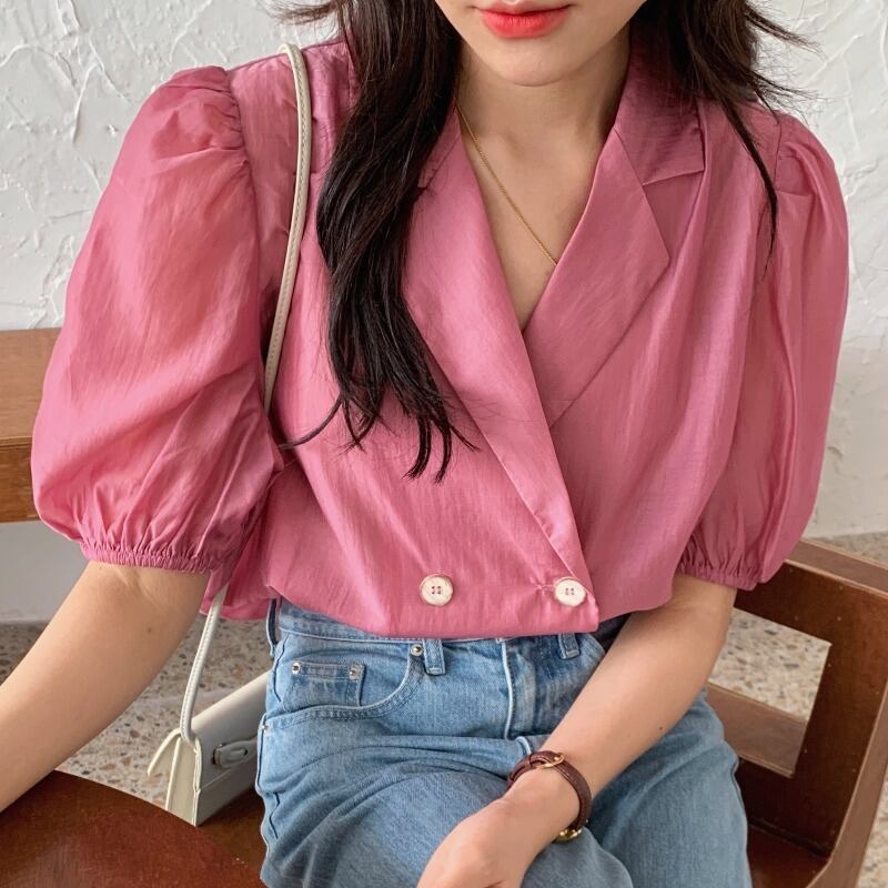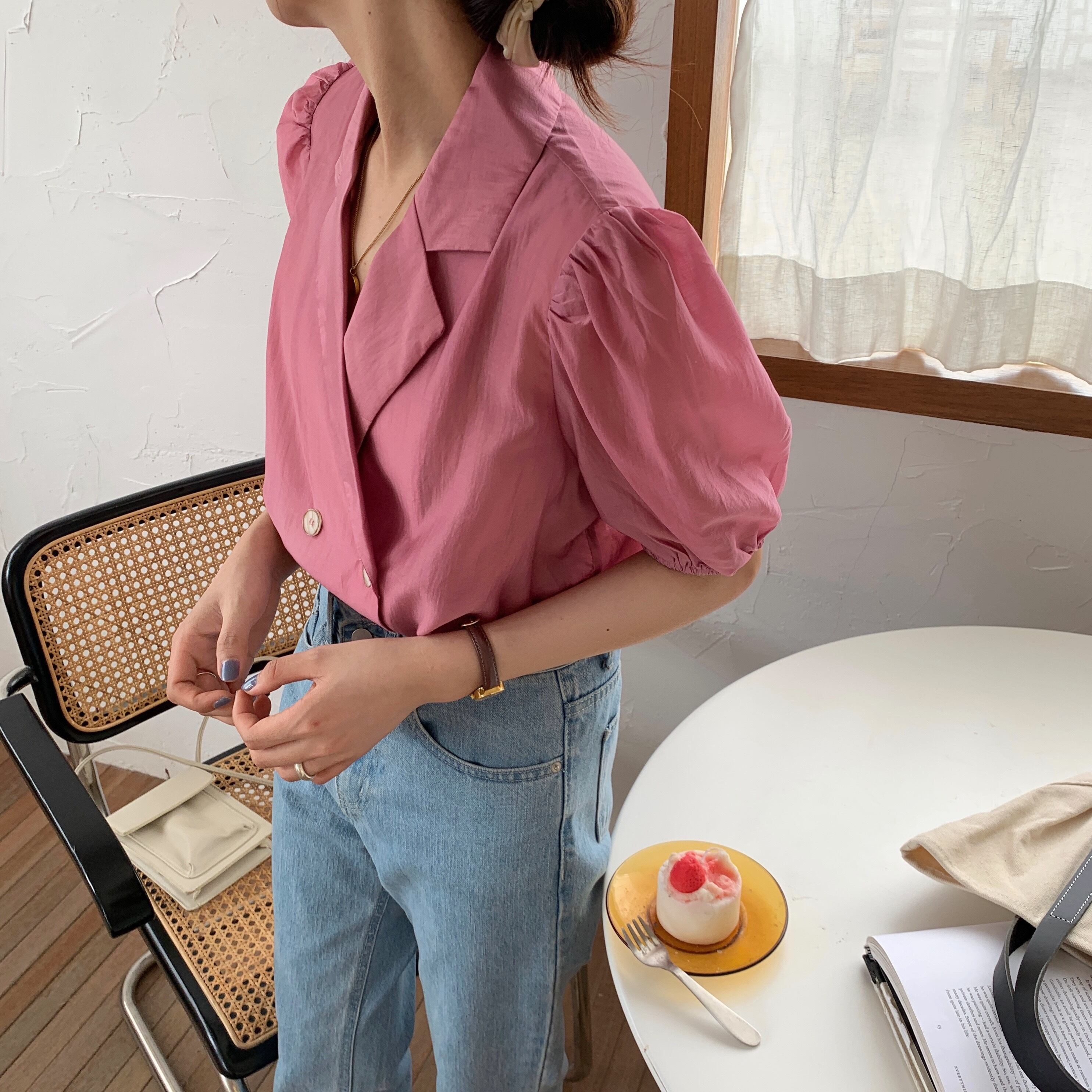 2020年新夏レトロ香港スタイルシャツシフォンルーズシックニッチフェミニンVネックブラウスダブルブレスト 韓国婦人19374446902