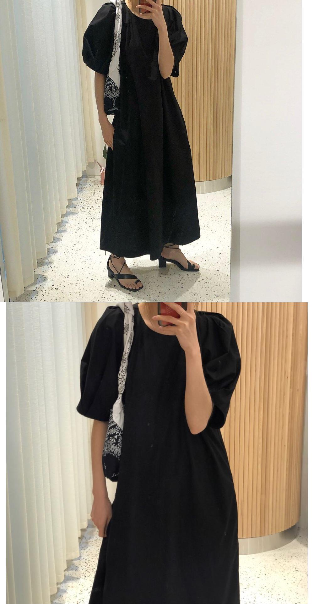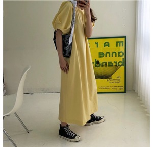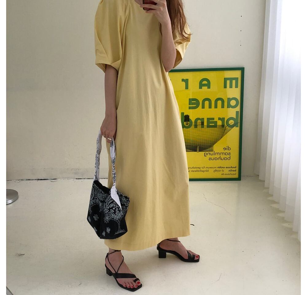 シックな夏のシンプルな怠惰な風ラウンドネックルーズ無地カジュアルロング膝丈パフスリーブドレス女性 韓国婦人9969568726