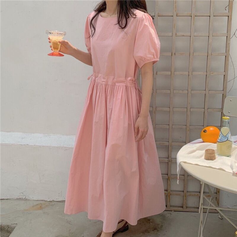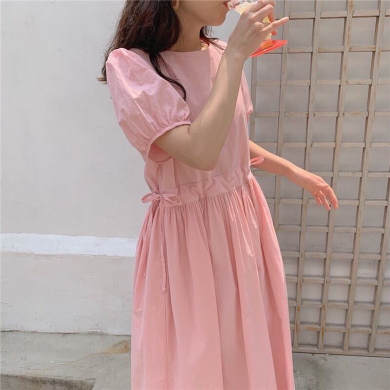 シックなスイートピンクのラウンドネックサイドドローストリング蝶ネクタイウエストルーズパフスリーブドレス女性 韓国婦人84144399885