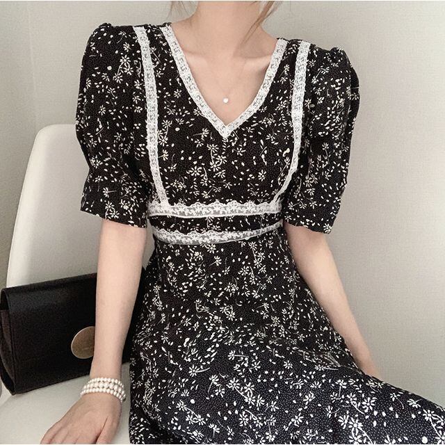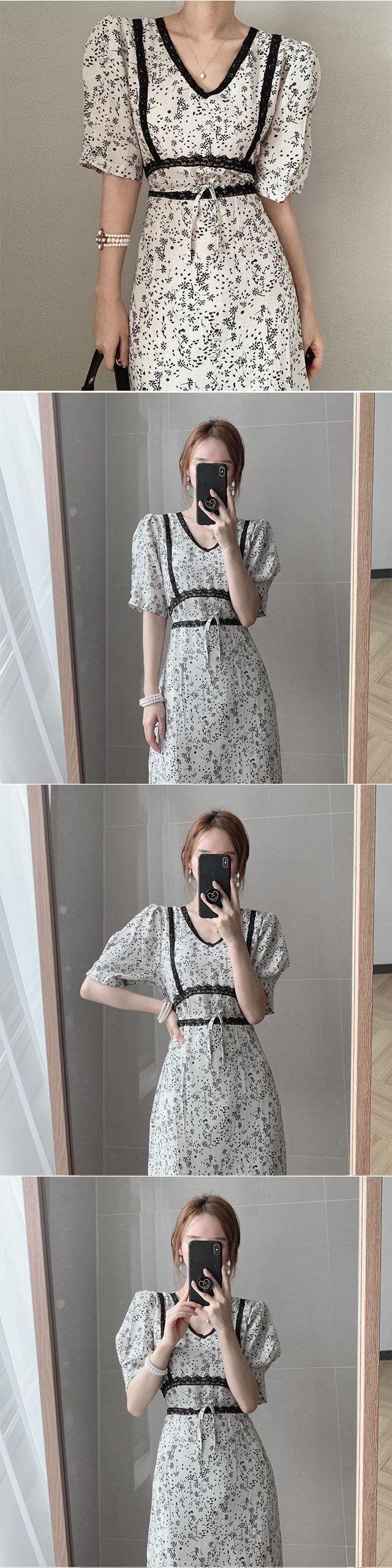 レースエッジVネックパフスリーブドレスサウスの東大門2021夏の新しいウエストプリントフィッシュテールスカートの女性 韓国婦人10613161142
