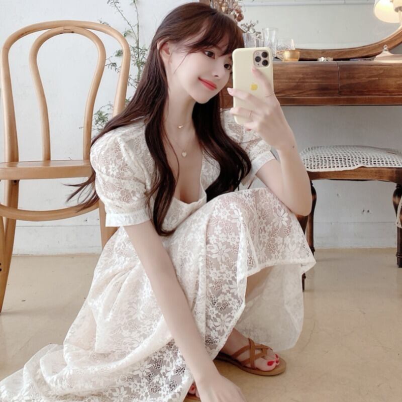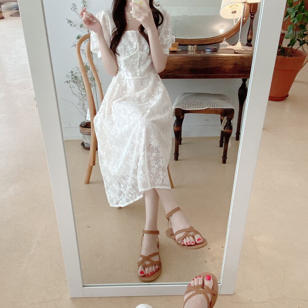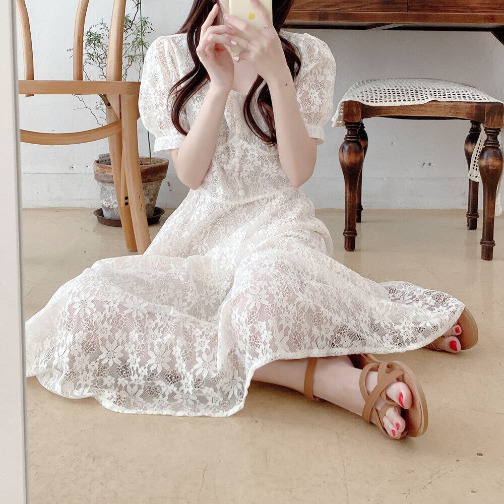 フランスのレトロなパフスリーブ水溶性レース中空ドレスミドル丈夏気質スクエアカラーウエストは細い夏でした 韓国婦人97230495220