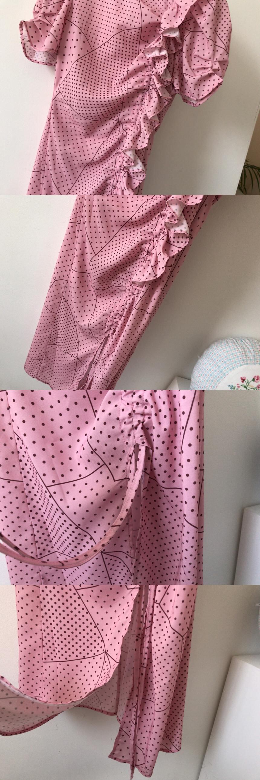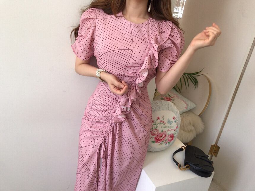 シックなeignエアピンク水玉ラウンドネックフリル巾着デザインスプリットパフスリーブロングドレス女性 韓国婦人84031829854