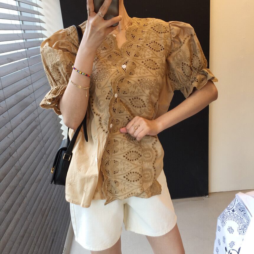 シックでエレガントなライトおなじみのニッチ斜めボタンレトロVネックレース中空パフスリーブデザインホワイトシャツ 韓国婦人6179983922