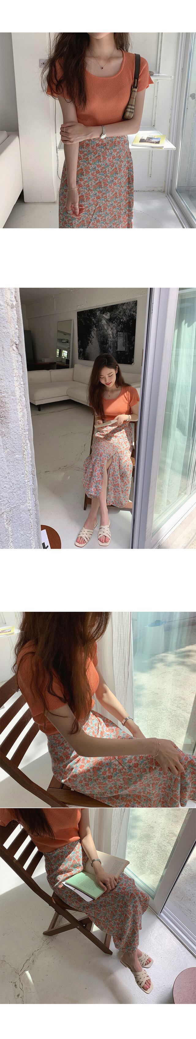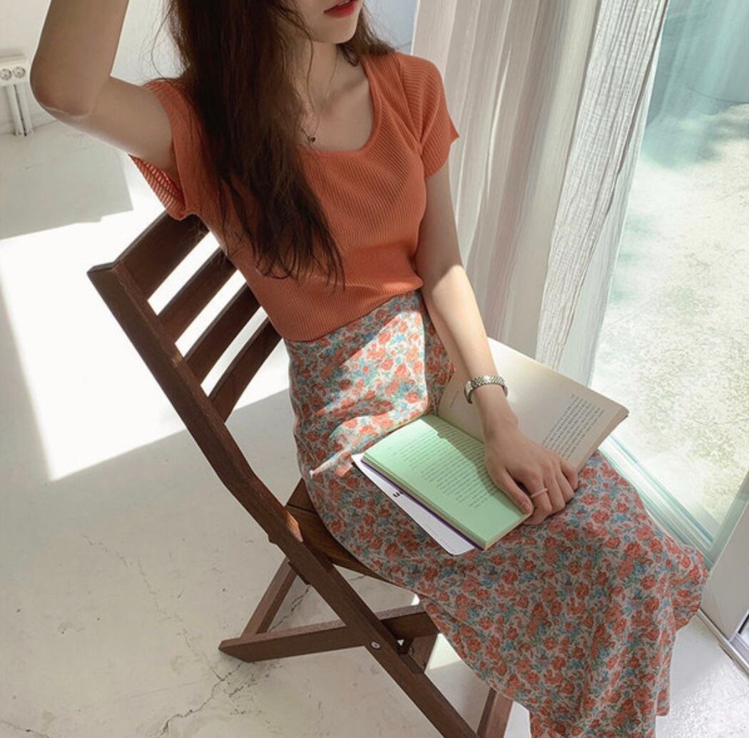 夏のニュースタイルシックなウエスタンスタイルのラウンドネックニットTシャツトップ+ハイウエストフローラルスカートツーピーススーツ女性 韓国婦人23122923747