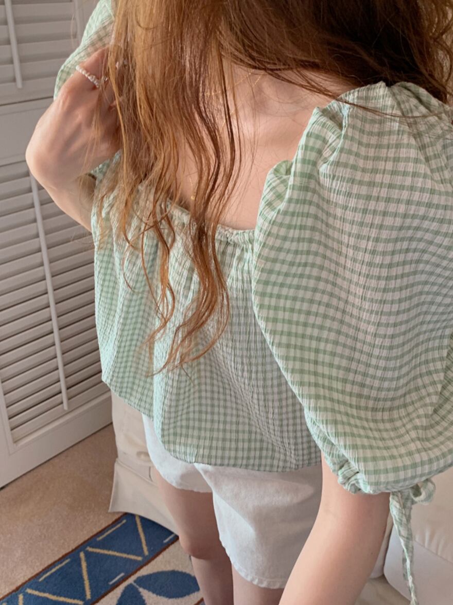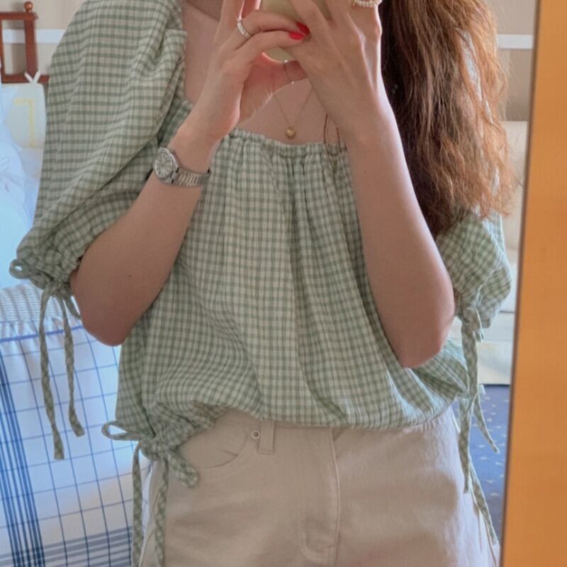 サウスシックな夏のレトロな薄いスクエアカラーの露出した鎖骨のひだとパフスリーブのチェック柄シャツシャツの女性 韓国婦人80544927962