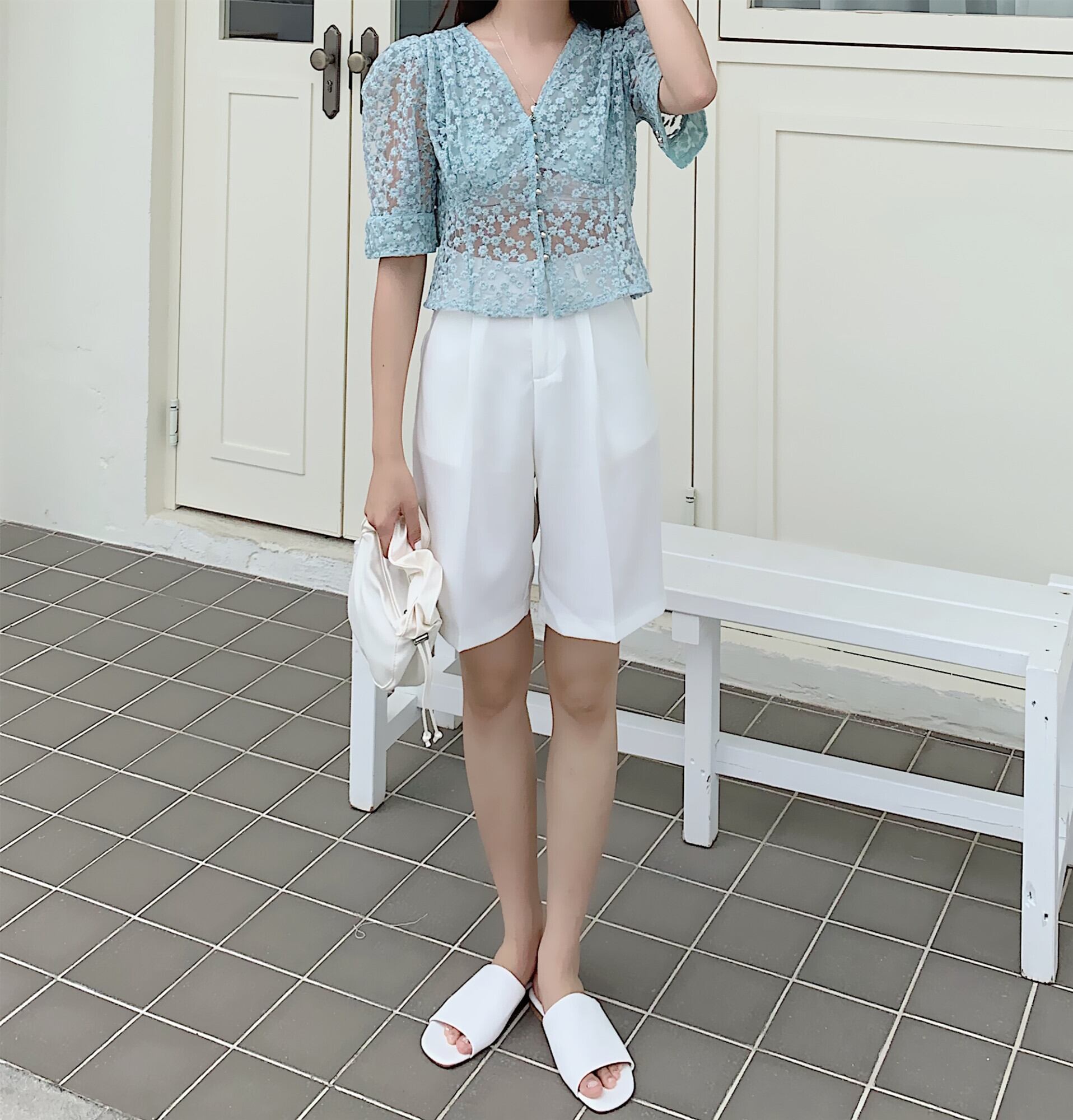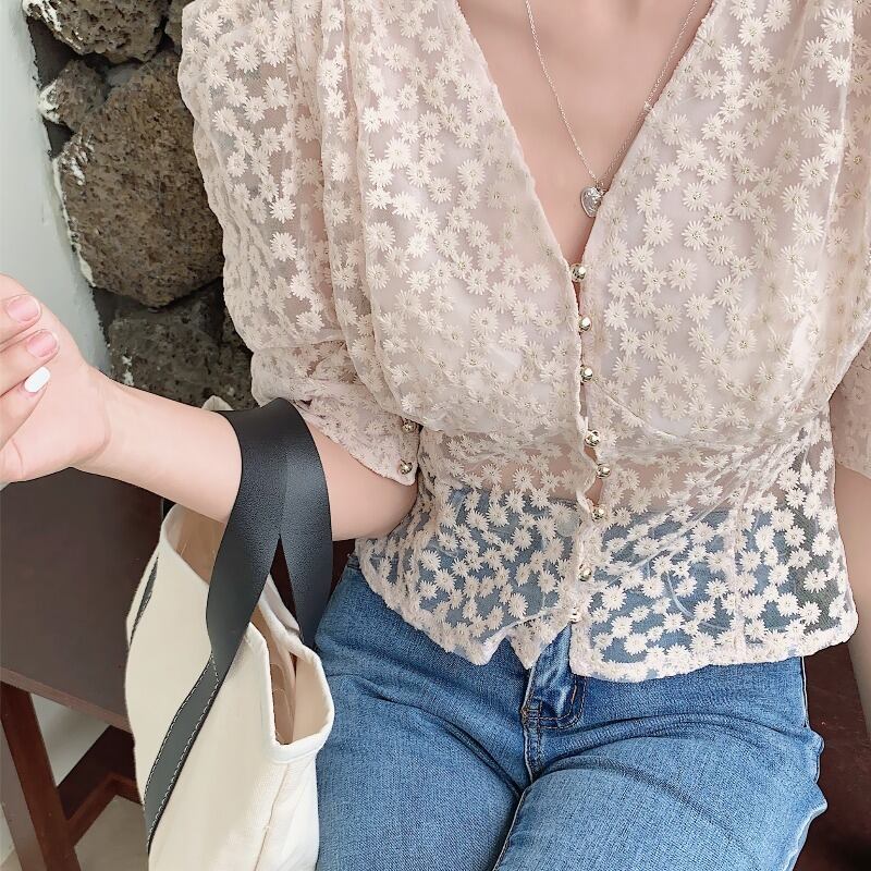 スリムレースシャツ ショートVネックトップス サマースタイル薄手 大人ガーリー スウィート キュート カジュアル 夏物 韓国婦人36808409047