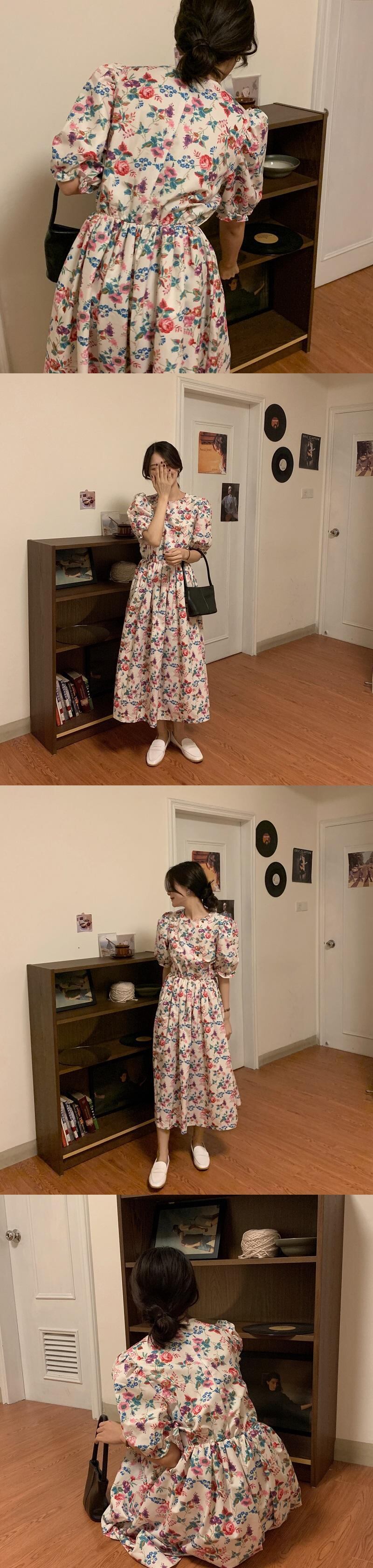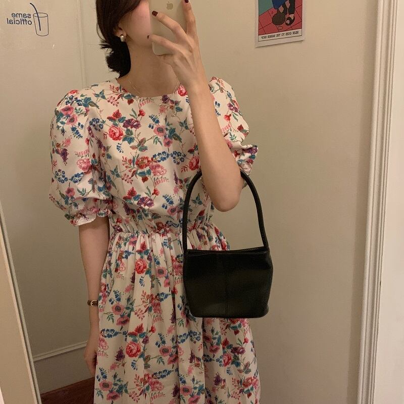 フローラルドレス スタンダードプリント柄ウェスト薄手スリーブ レトロ 大人ガーリー スウィート キュート カジュアル 花柄 韓国婦人43312055412