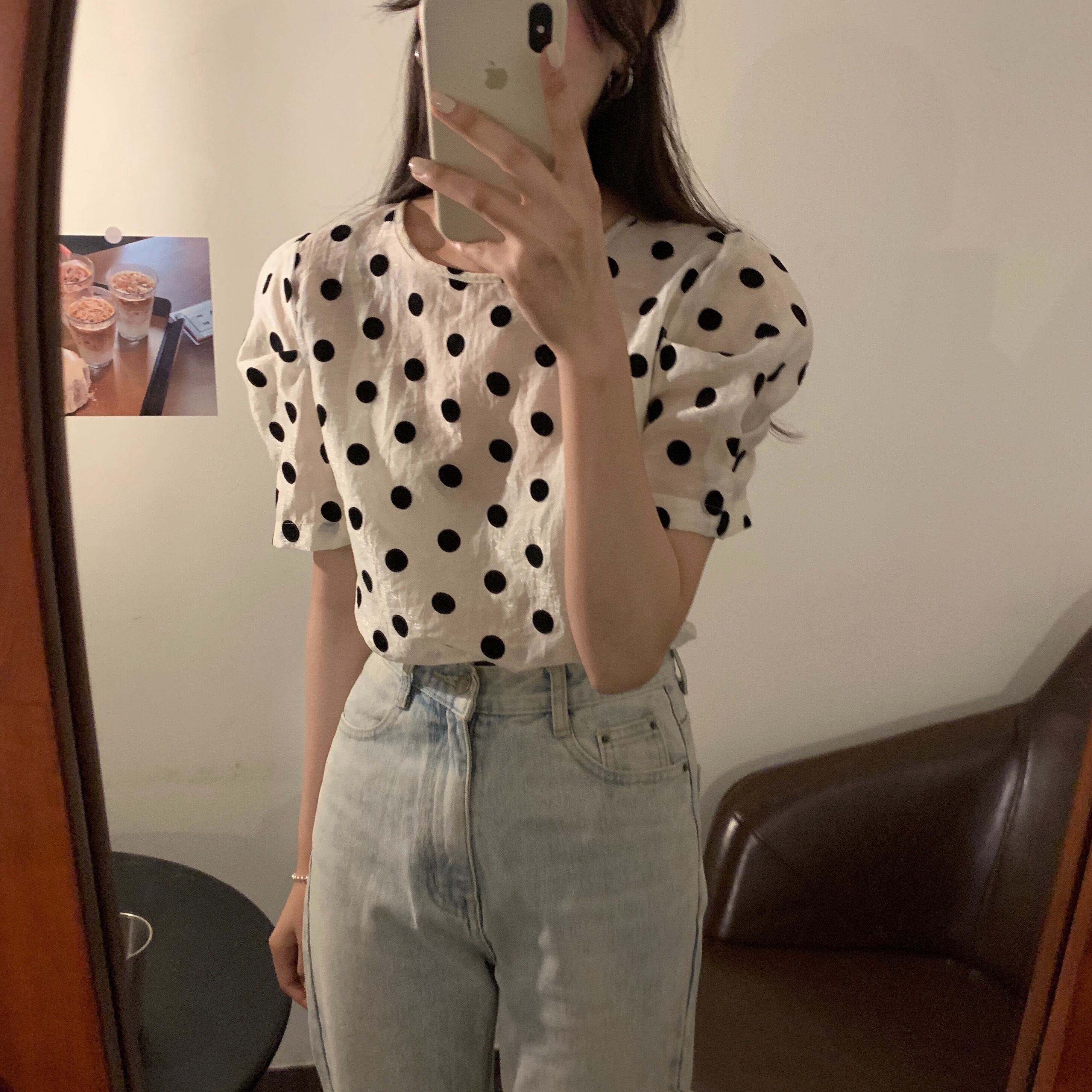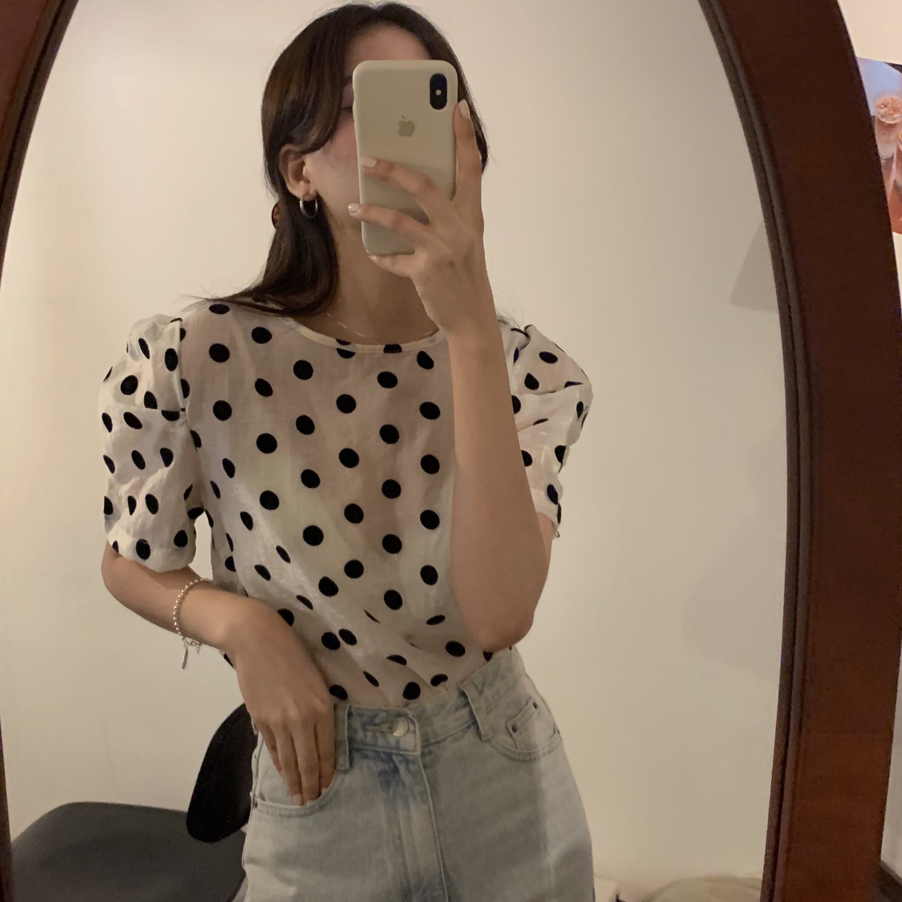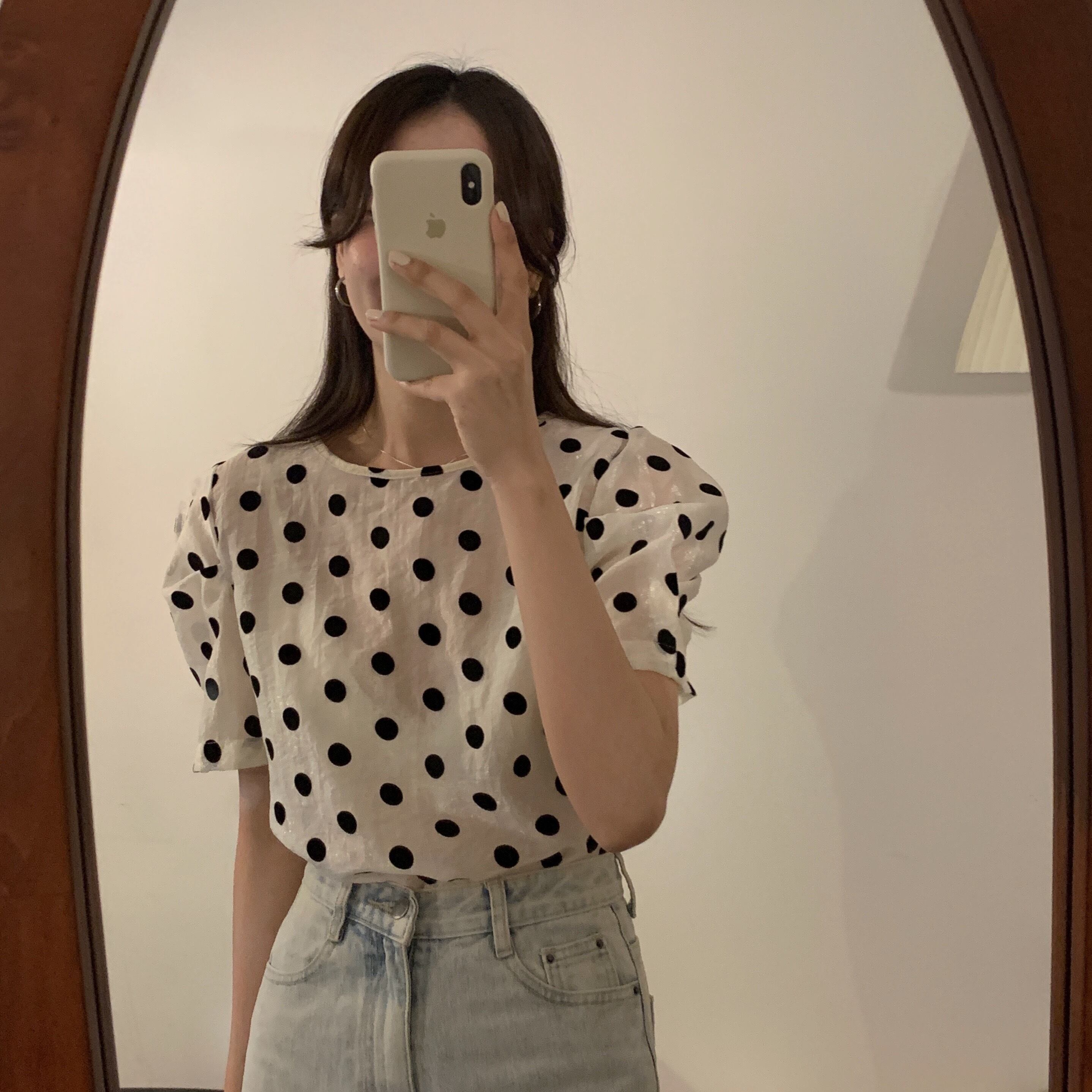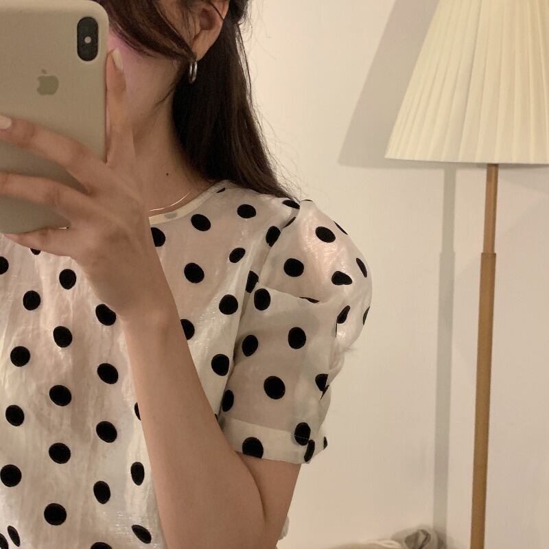 サマースタンダードブラックホワイト水玉ラウンドネックルーズ薄手スリーブシャツ トップス レディース レトロ 夏物 Oネック 韓国婦人88914353978