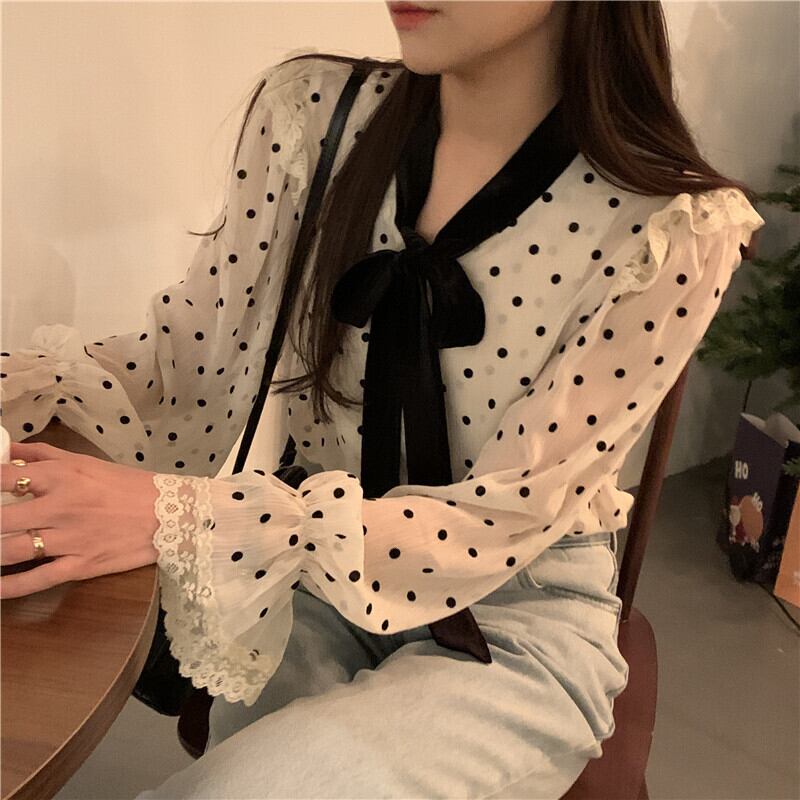 スタンダードスタイルリボンシャツ ブラウス スプリング ロング レトロ 春物 韓国婦人3442512826