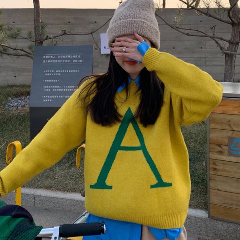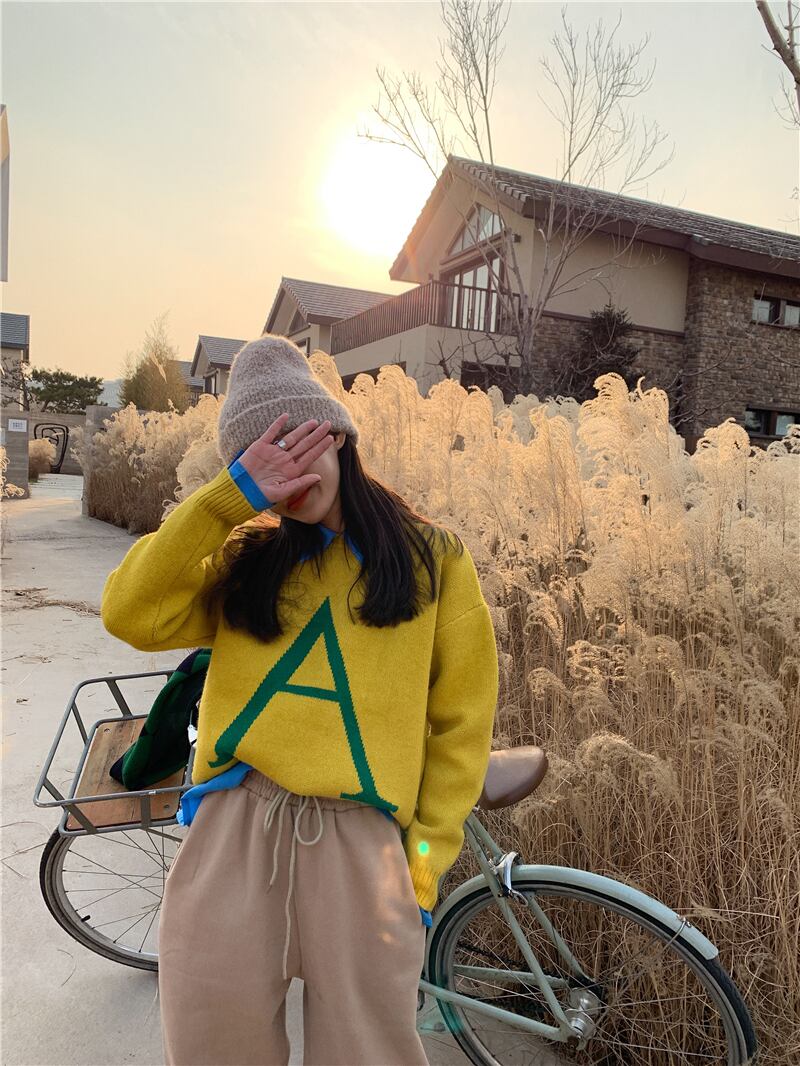 スプリングイエローセーター ルーズプルオーバー ラウンドネック 春物 Oネック 韓国婦人1780060604