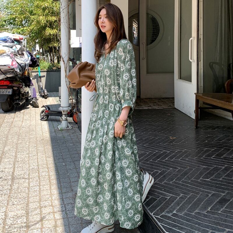 スプリングルーズロングVネックレースフローラルドレス 春物 花柄 韓国婦人88016102140