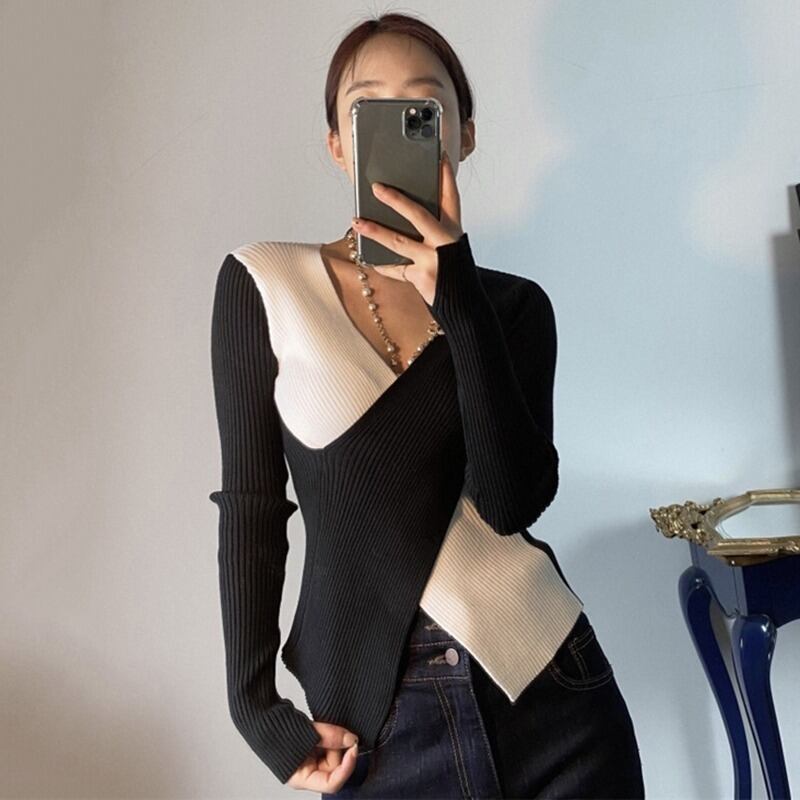 スプリングスタンダードVネックブラックホワイトカラースリムセーター トップス レディース ロング レトロ 春物 韓国婦人15111154387