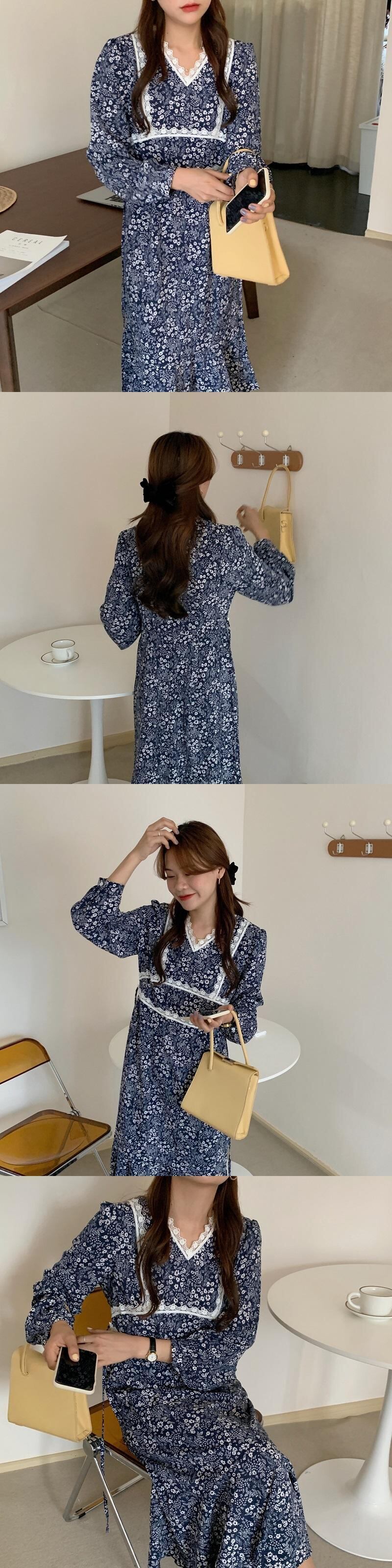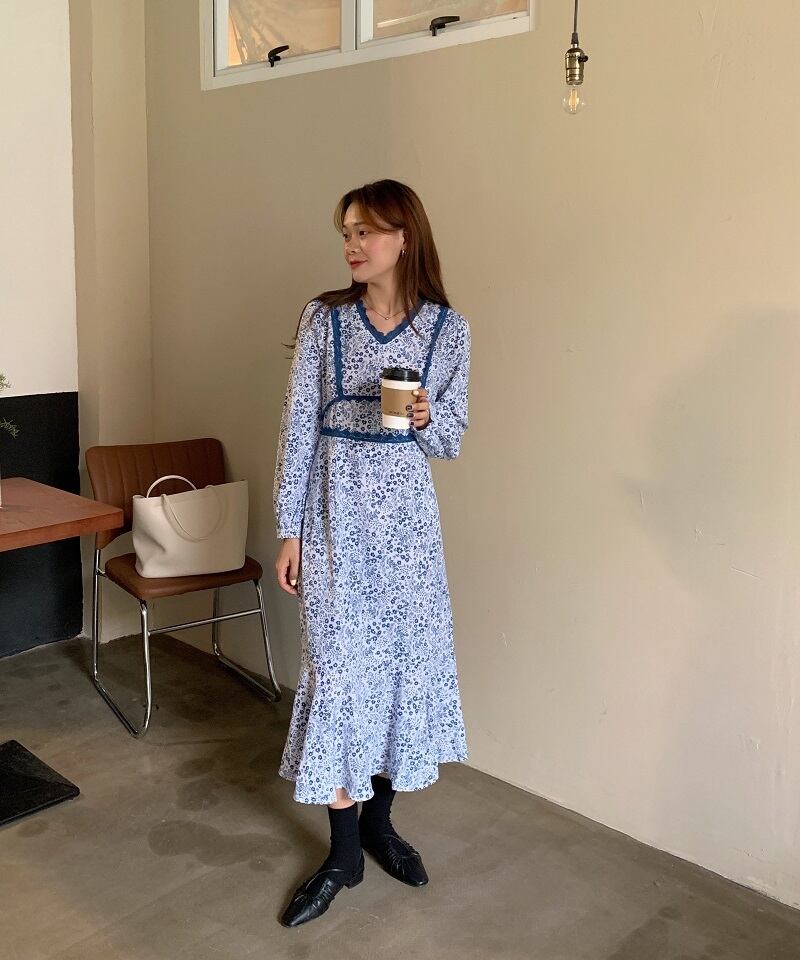 スカート スプリングカラーVネックレースフローラルパターンウェスト長袖スリーブドレス レディース ロング 春物 花柄 韓国婦人15094119698