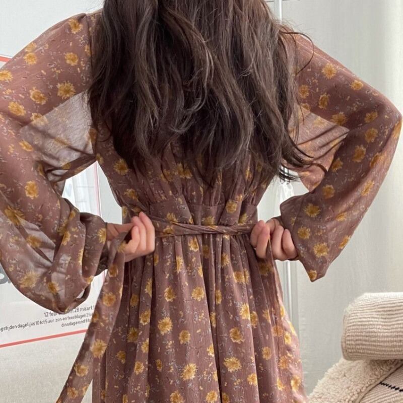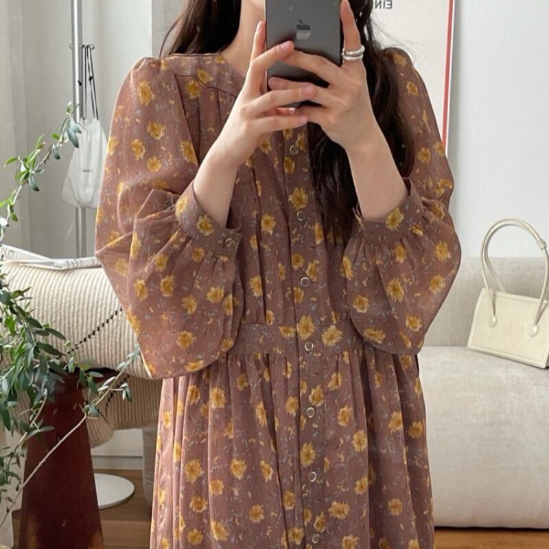 フローラルドレス スプリングウェストスリムスカート 長袖スリーブシャツ ロング 春物 花柄 韓国婦人15668167071