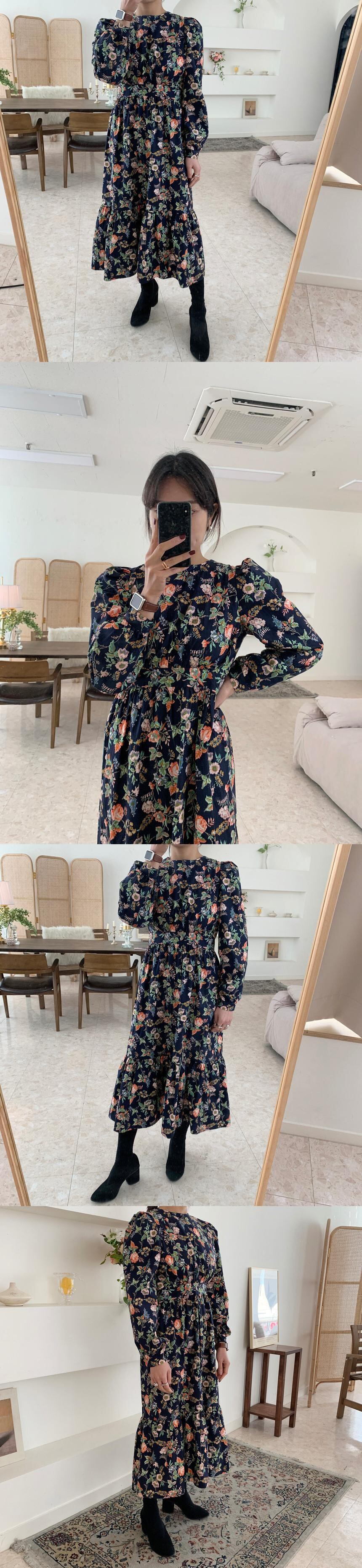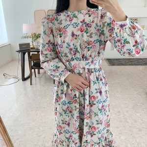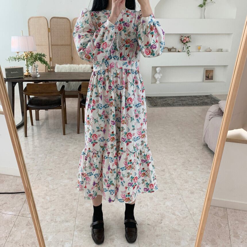 スタンダードフローラルラウンドネックウェストロングスリーブドレス レトロ 花柄 Oネック 韓国婦人50299151207