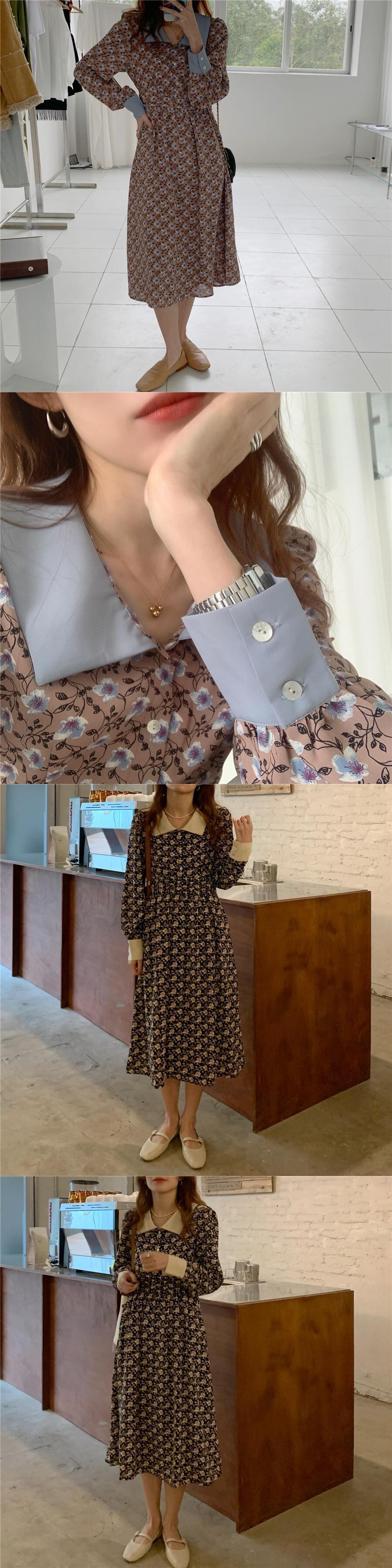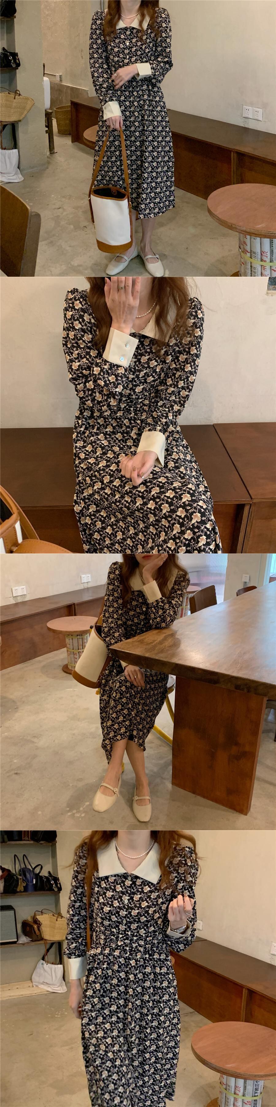 フローラルシフォンロングスカート スプリングカラースタンダードスリムドレス レトロ 春物 花柄 韓国婦人37334885943