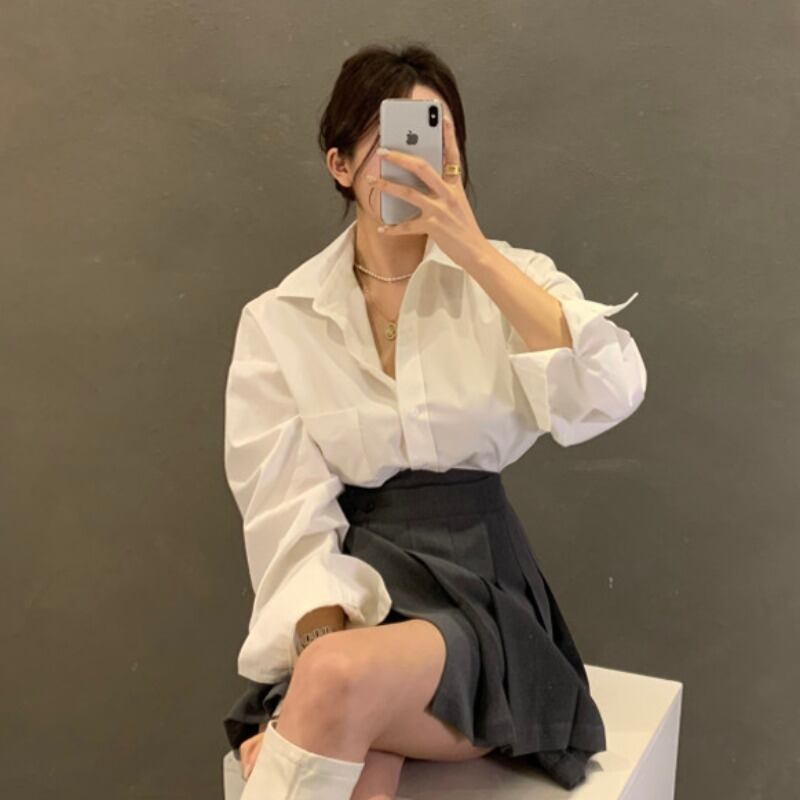 シャツ ハイウェストプリーツスカート レッド ロング 韓国婦人37716700543