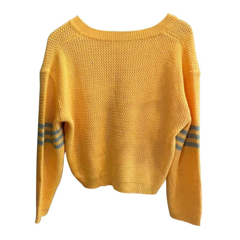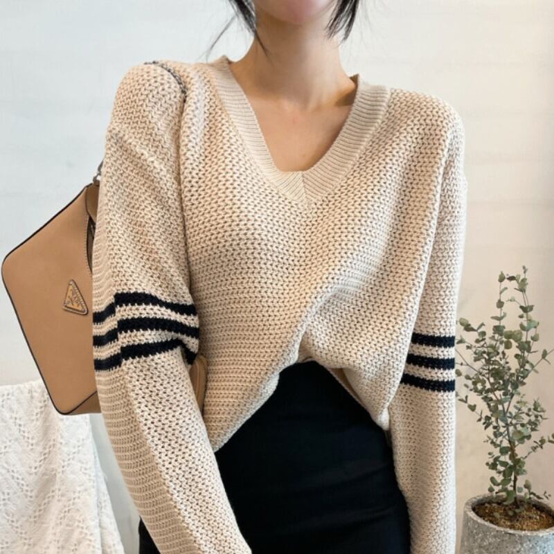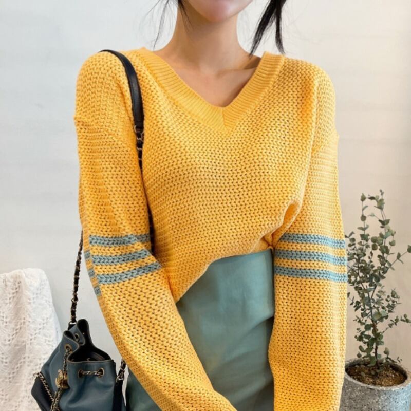 ニットトップス スプリングカラーストライプルーズVネックプルオーバー セーター ロング 春物 韓国婦人83425038546
