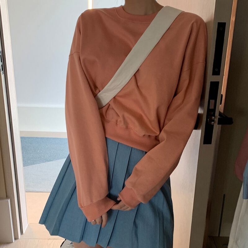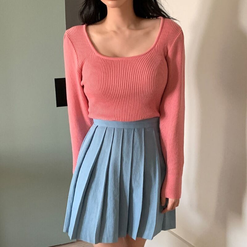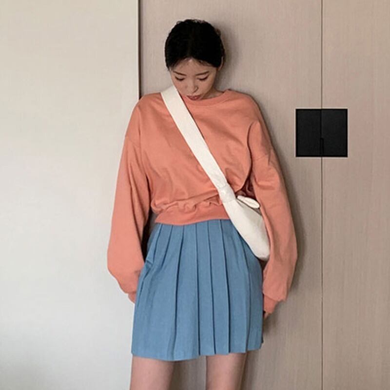 色:ピンクのセーター,ピンクのセーター,デニムプリーツスカート