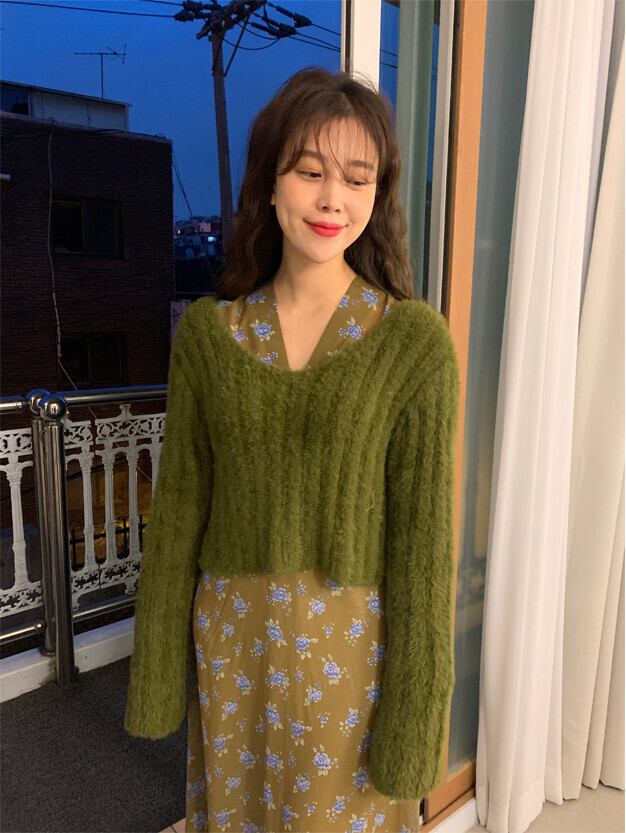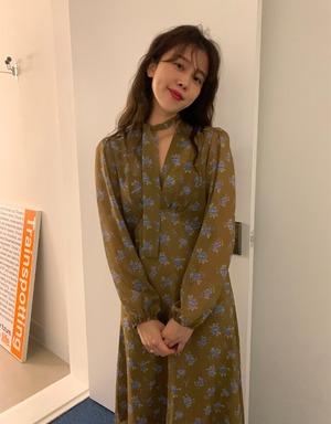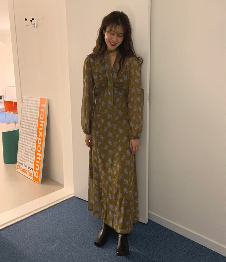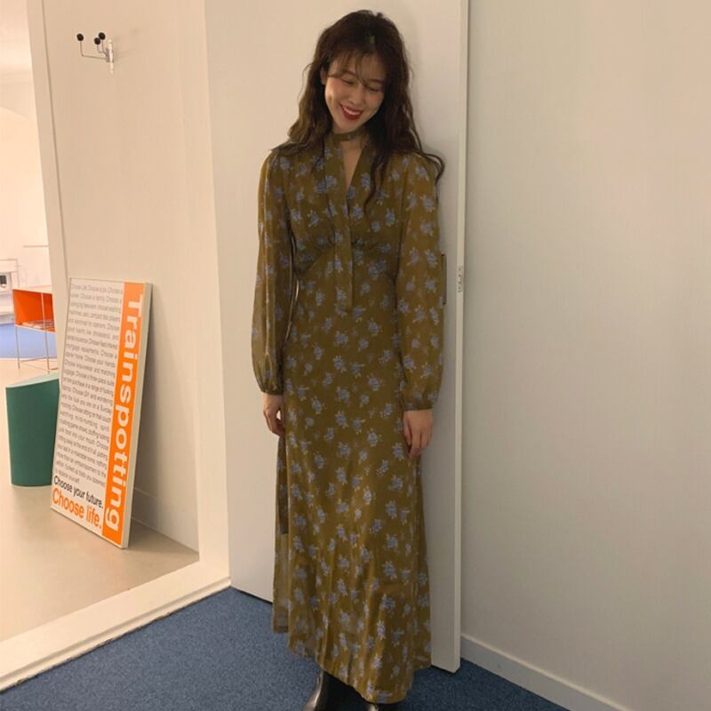スプリングスタンダードVネックルーズドレス フローラルシフォンロングスカート レトロ 春物 花柄 韓国婦人10339418999