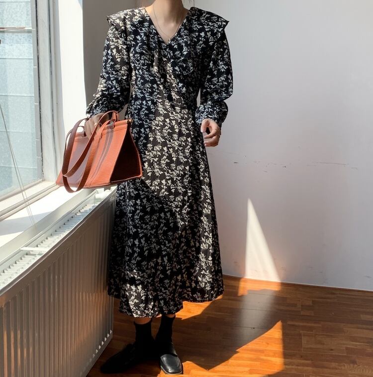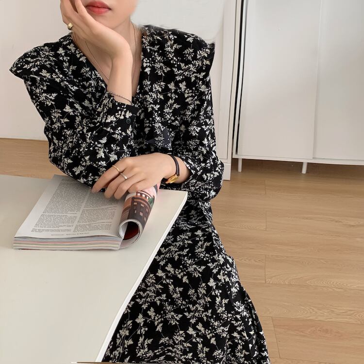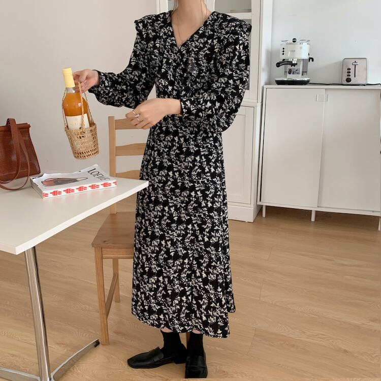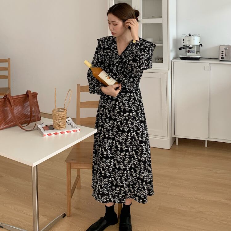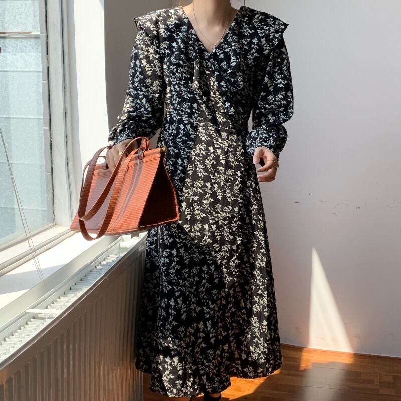 スプリングスタイル薄手Vネックフローラルドレス レディース ロング 春物 花柄 韓国婦人69718841304