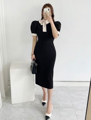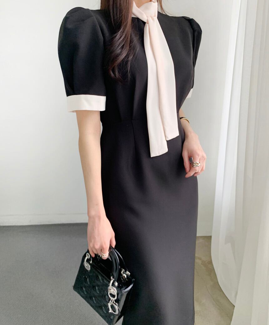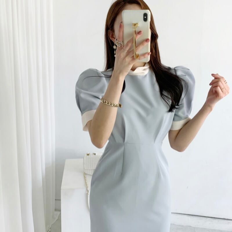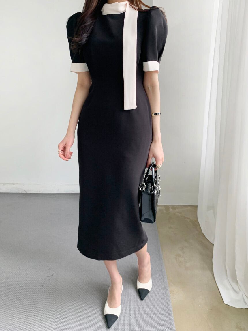 カラーハイウェストウェストスリムスリーブロングドレス 韓国婦人28031928656