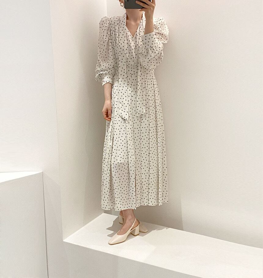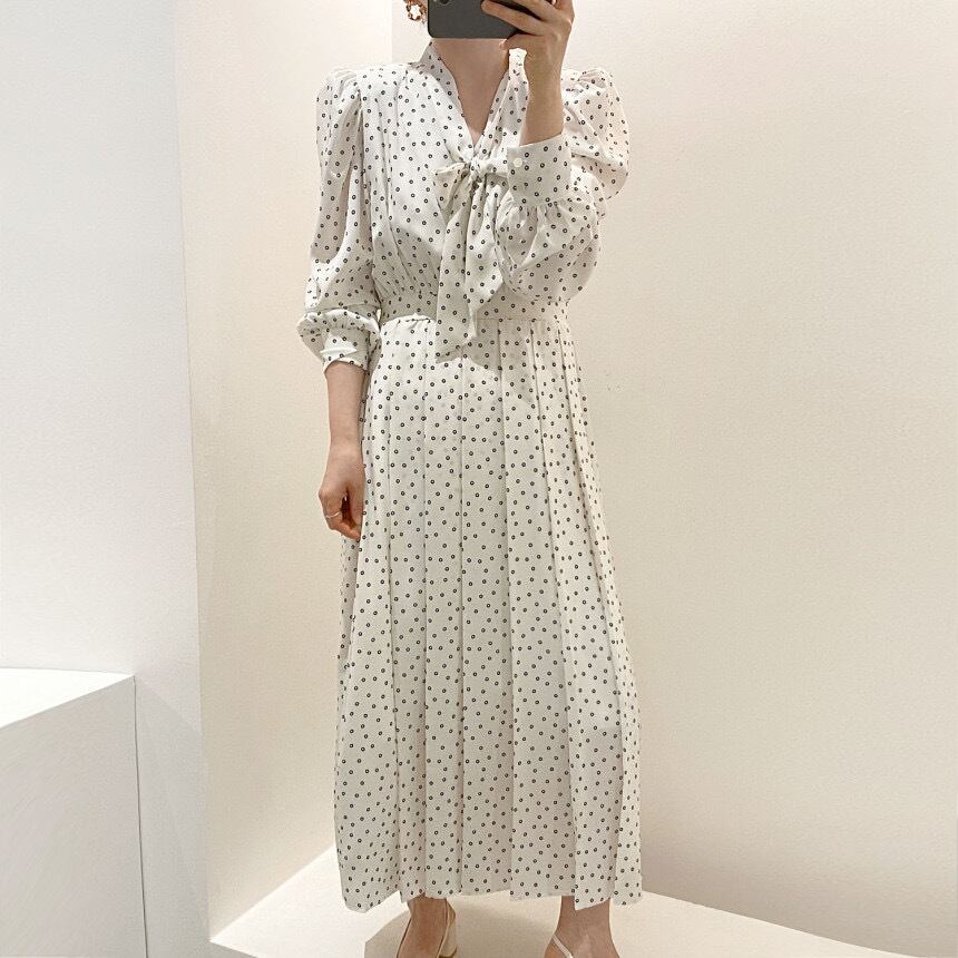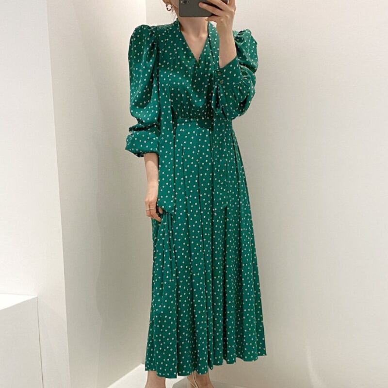 スプリングサマーVネックスリーブウェストロングシフォンドレス 大人ガーリー スウィート キュート カジュアル 春物 夏物 韓国婦人10535043375