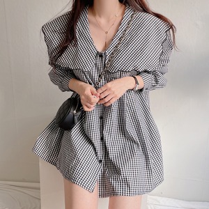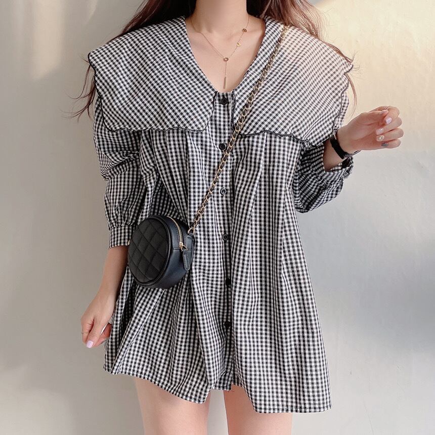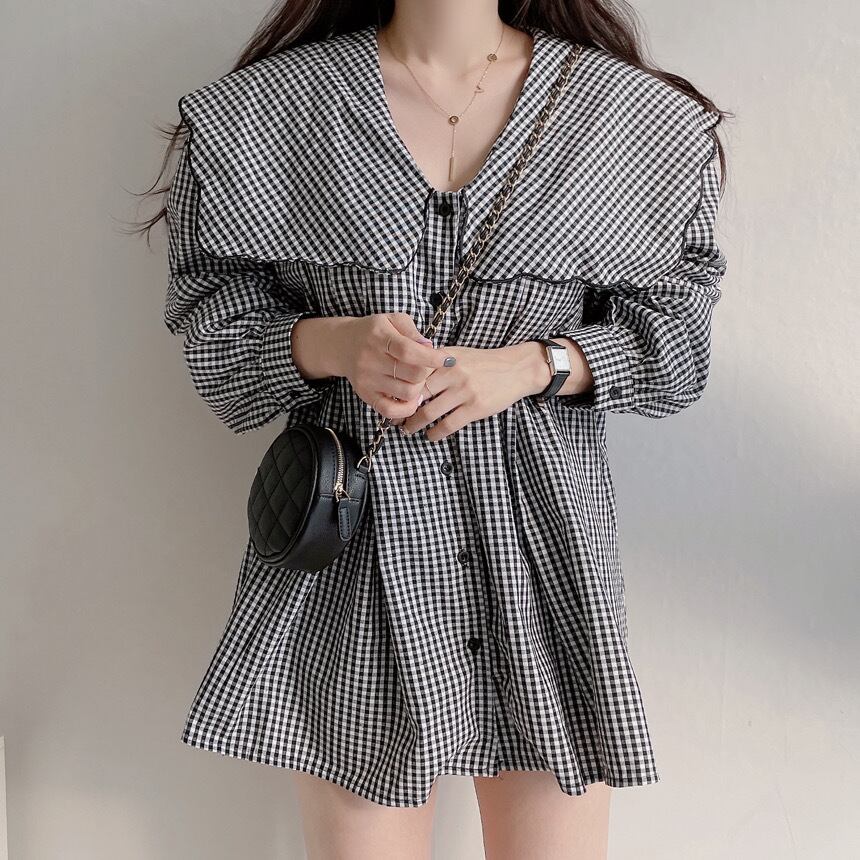 スタンダードネイビーカラー格子柄シャツ スプリングスタイルルーズレディース ロング レトロ 大人ガーリー スウィート キュート カジュアル 春物 韓国婦人26360450616