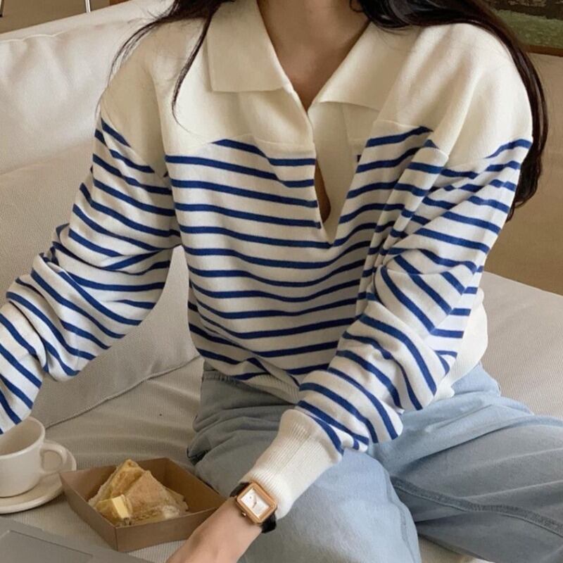 ストライプシャツ レディーススタイルスプリングショートトップス セーター 春物 韓国婦人23118044787