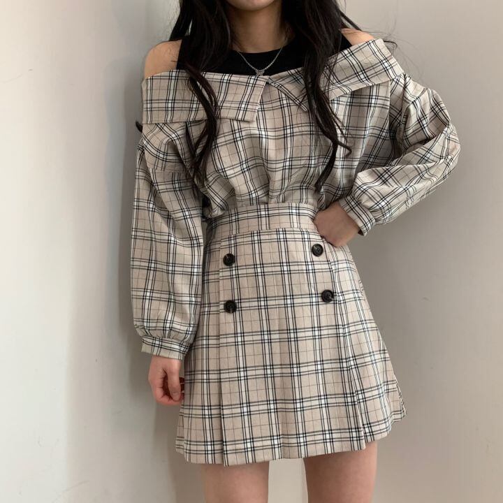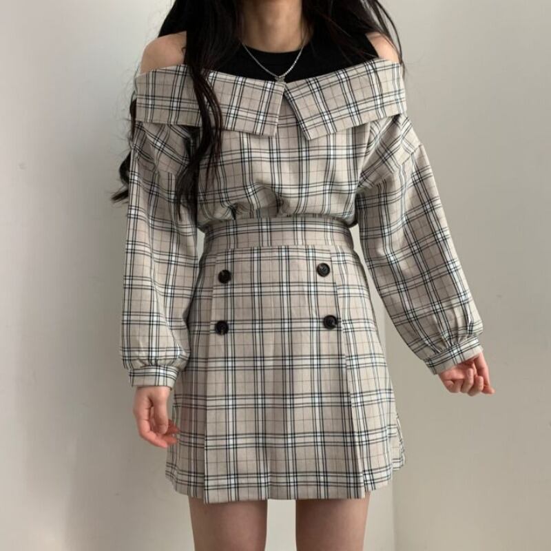 スプリング格子柄トップス ブレストショートスカート スタイル ロング 春物 オフショルダー 韓国婦人17866864245