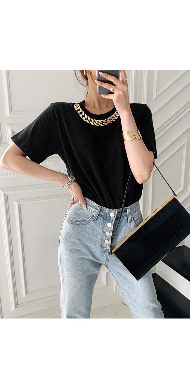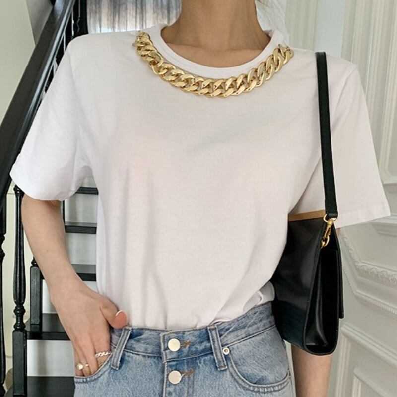 サマーチェーン ラウンドネックプルオーバー ソリッド カラーカジュアルルーズTシャツ トップス 夏物 Oネック ソリッドカラー 韓国婦人16414835659
