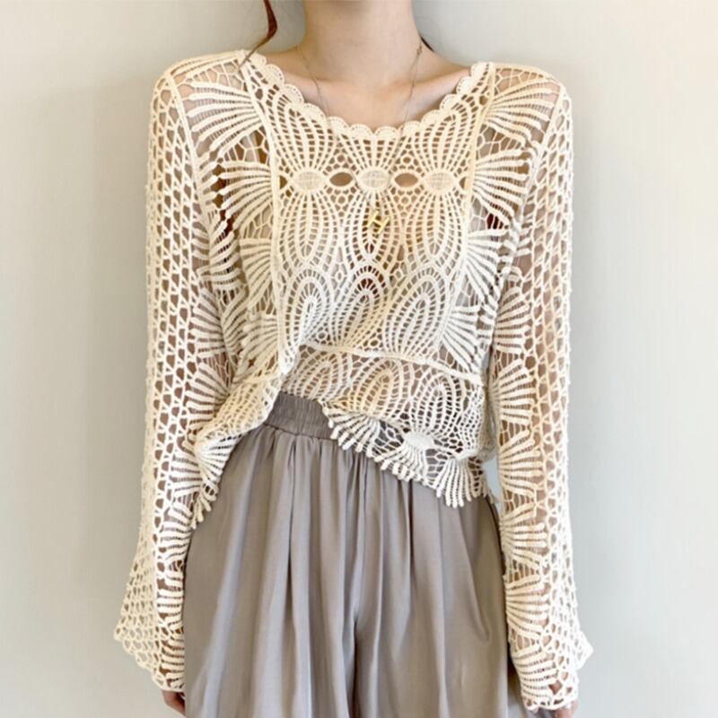ラウンドネックレースルーズプルオーバー シャツ トップス レディース ロング Oネック 韓国婦人96443794717