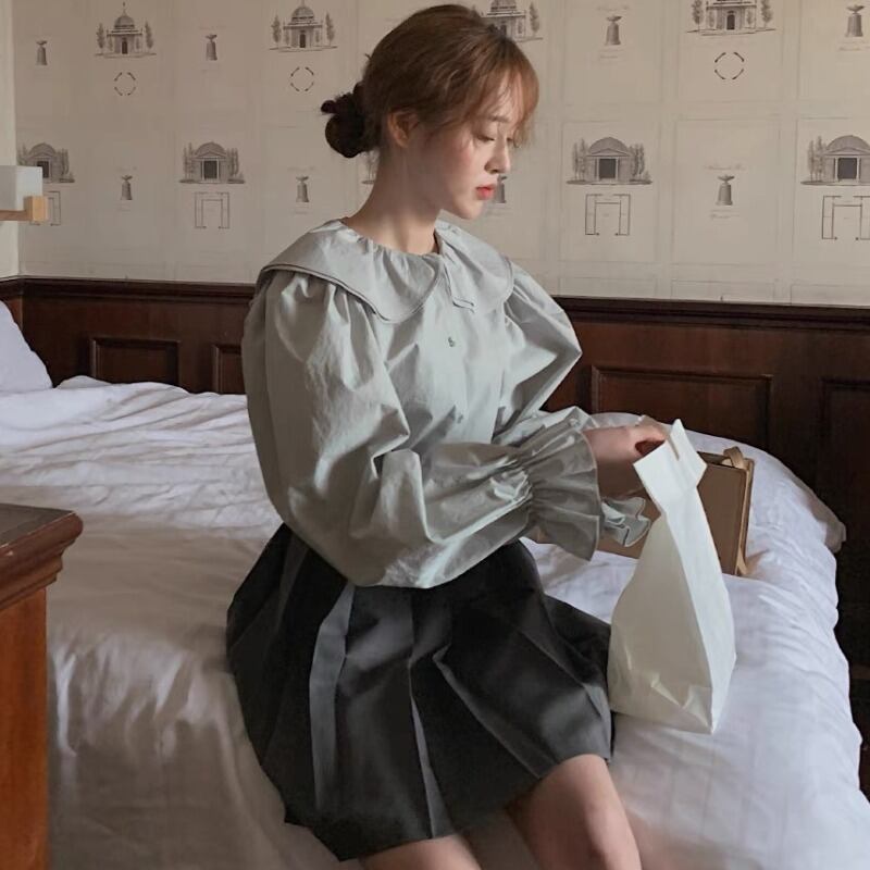 色:クリーミーな白いシャツ,ミントシャツ,ブラックデニムスカート,ダークブルーのデニムスカート