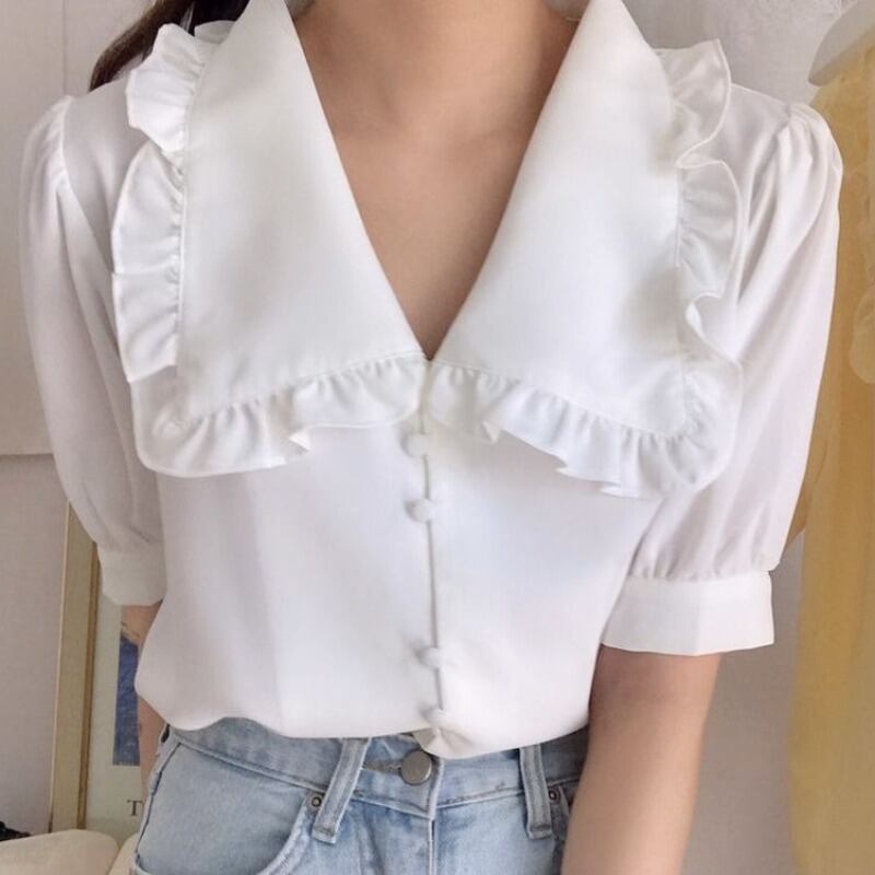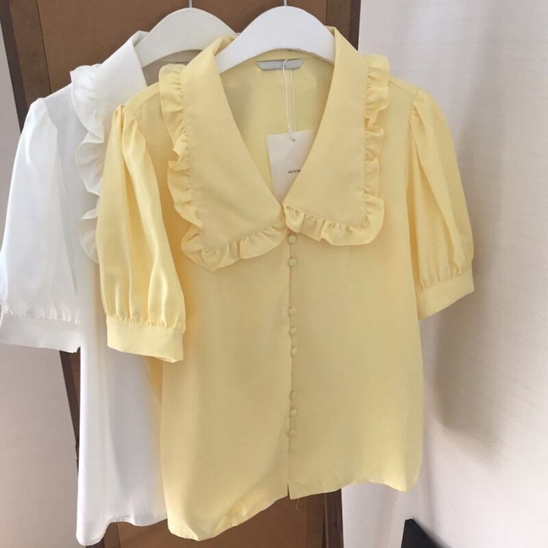 サマースタンダードイエローシャツ カラーシフォンブラウス レトロ 大人ガーリー スウィート キュート カジュアル 夏物 韓国婦人10514120344