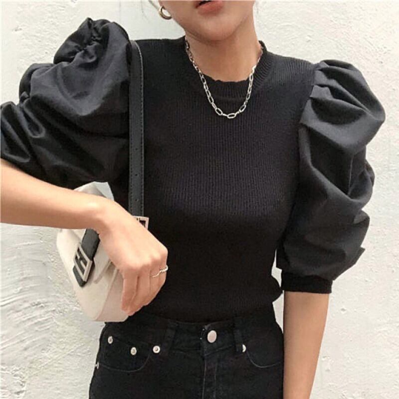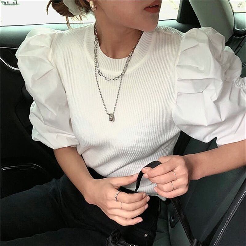 スプリングサマースタイルニットスリーブシャツ ホワイトトップス 春物 夏物 ステッチ 韓国婦人77380525766