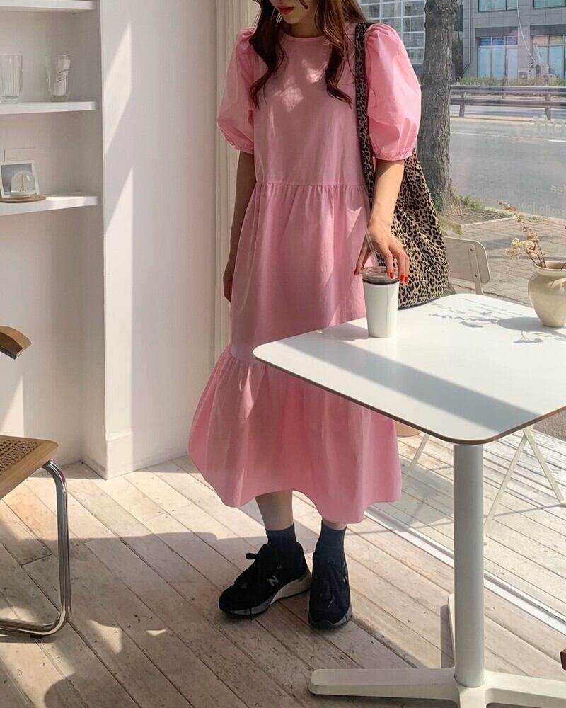 サマーパウダースタンダードスリーブラウンドネックハイウェストウェストルーズロングドレス レトロ 大人ガーリー スウィート キュート カジュアル 夏物 Oネック 韓国婦人84047312013