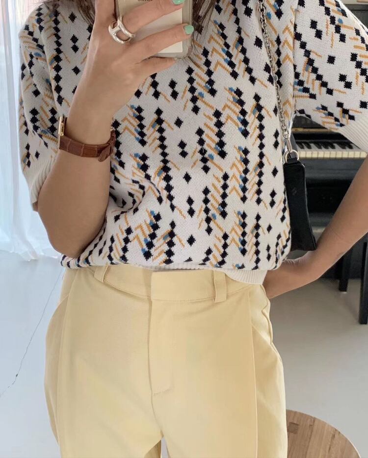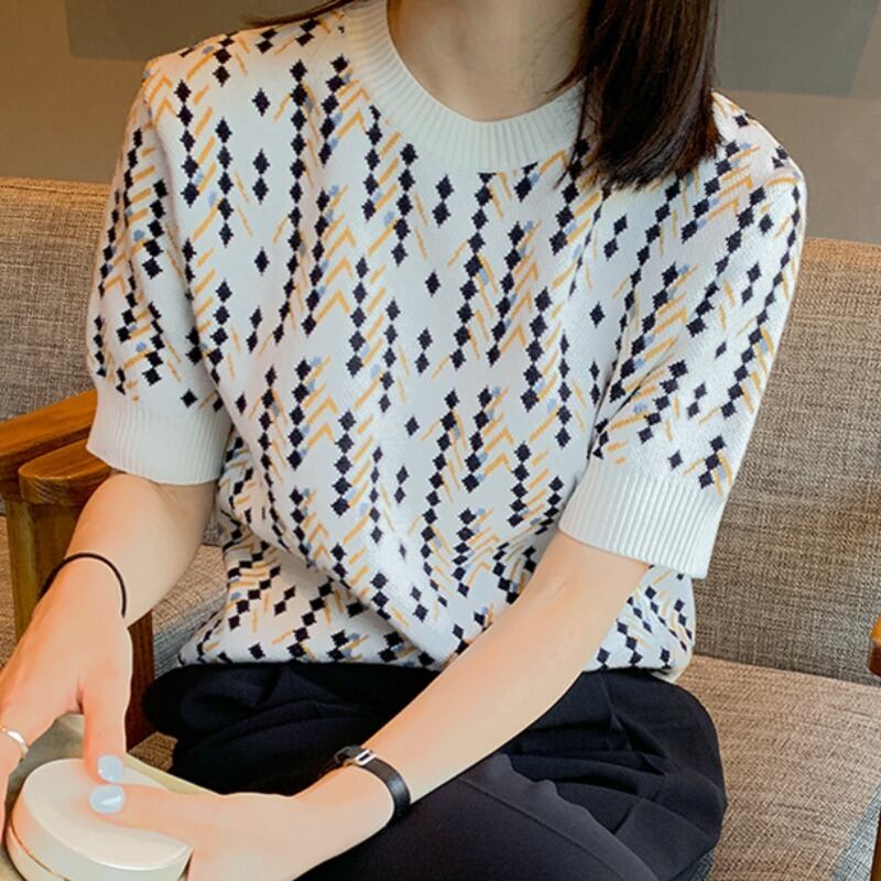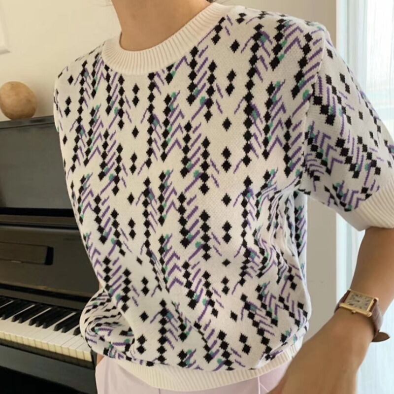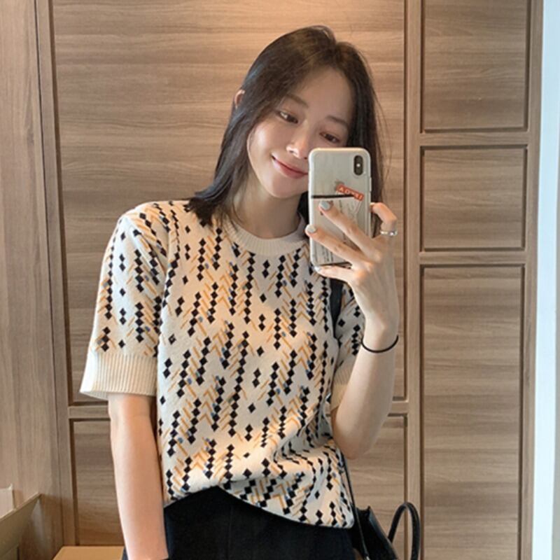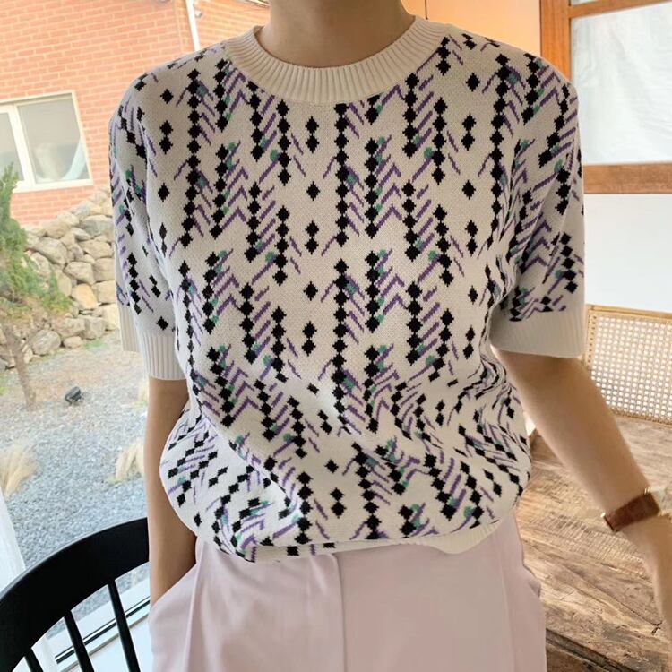 サマーパターンシャツ トップス スタンダードセーター レトロ 夏物 韓国婦人89511112701