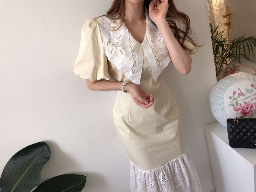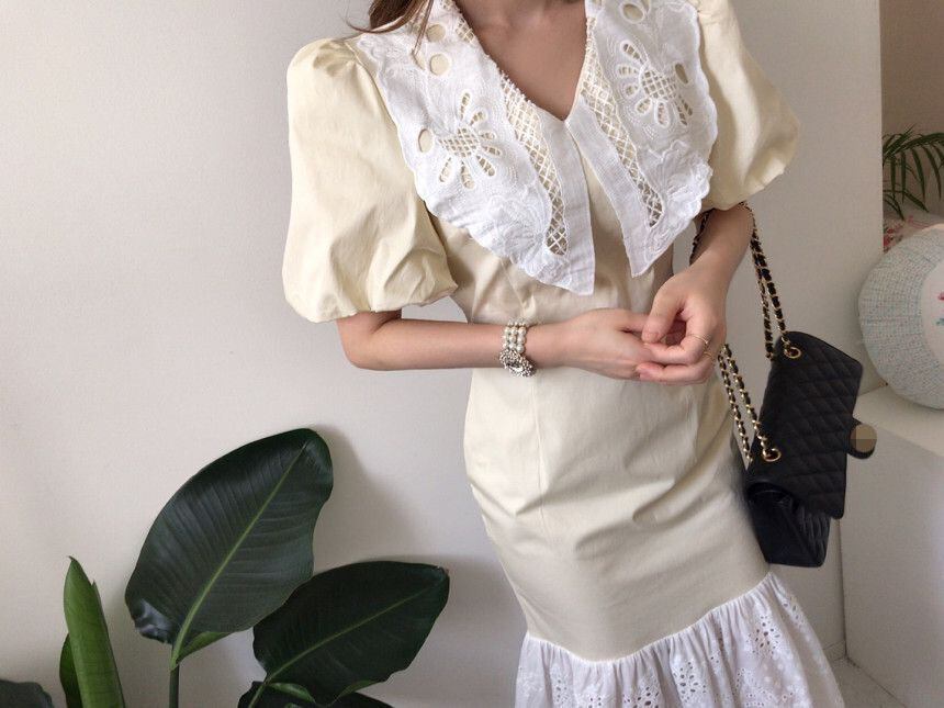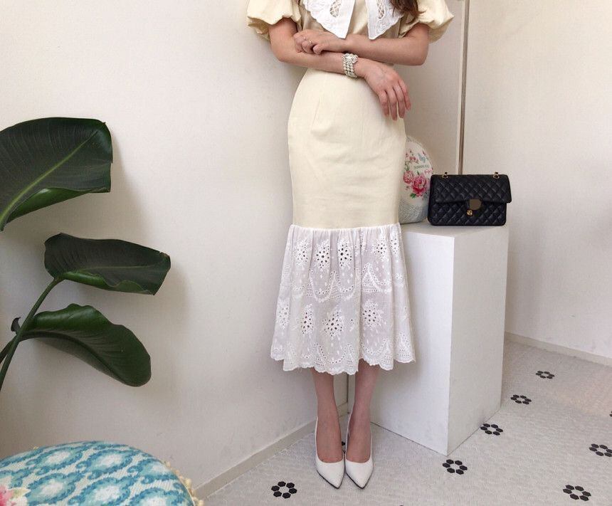 サマーレーススリーブウェストドレス ロングスカート 大人ガーリー スウィート キュート カジュアル 夏物 韓国婦人5719090826