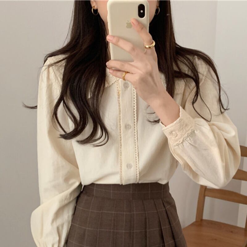 スプリングスタンダードレースシャツ カラールーズレディース ロング コットン レトロ 大人ガーリー スウィート キュート カジュアル 春物 ステッチ 韓国婦人21886970643