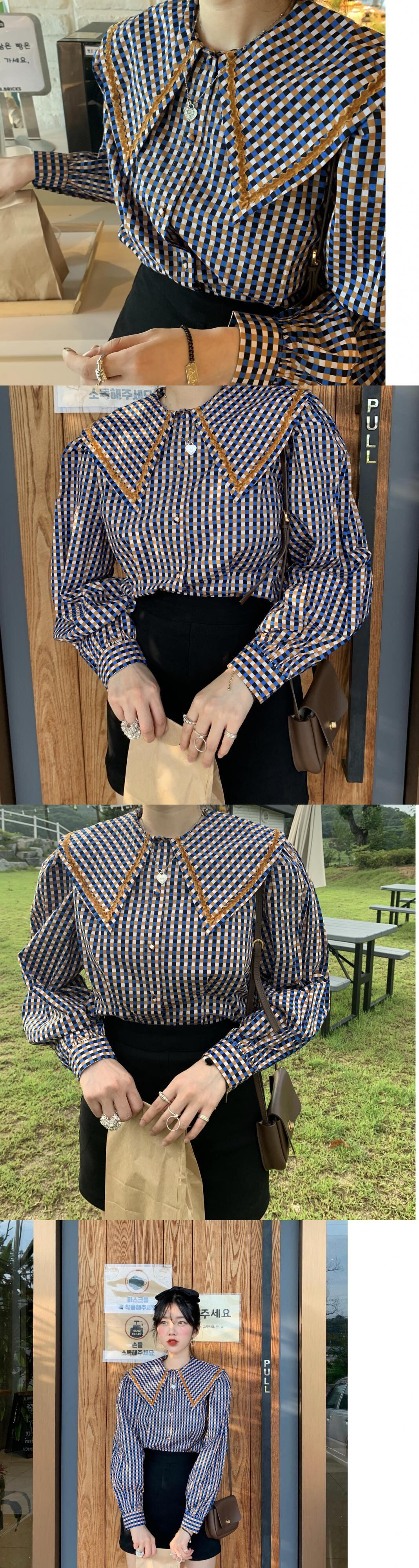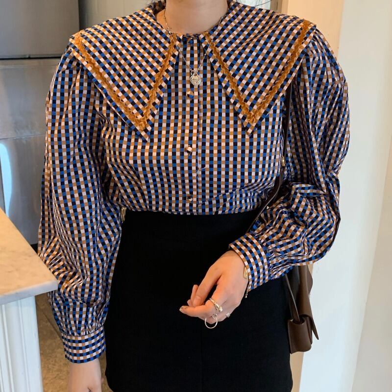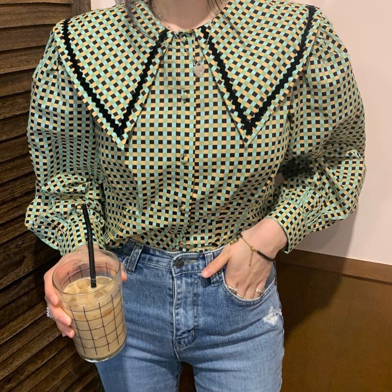 スプリングトップス スリーブルーズグリーン格子柄シャツ レディース 春物 韓国婦人30030501189