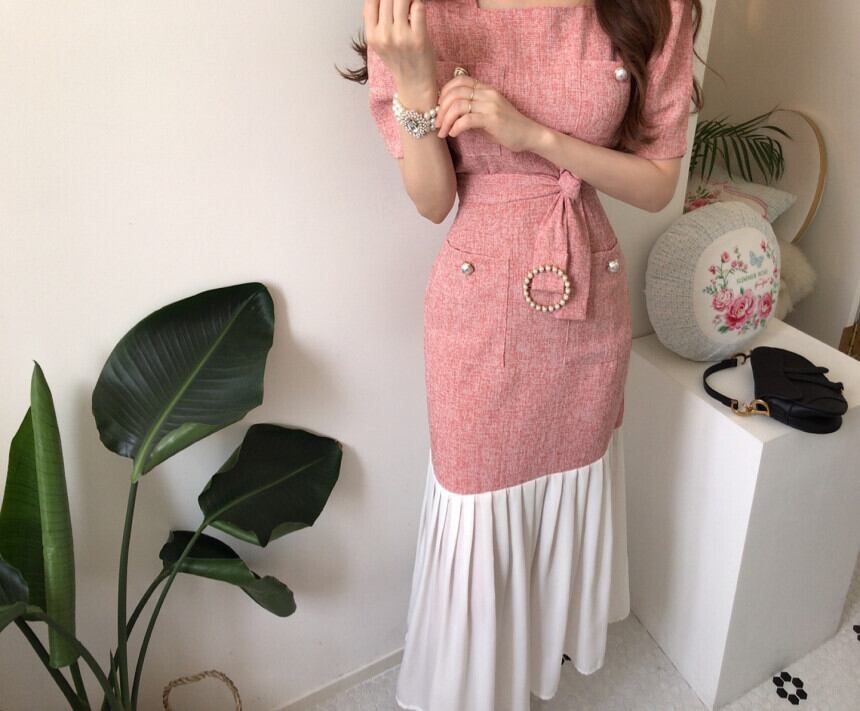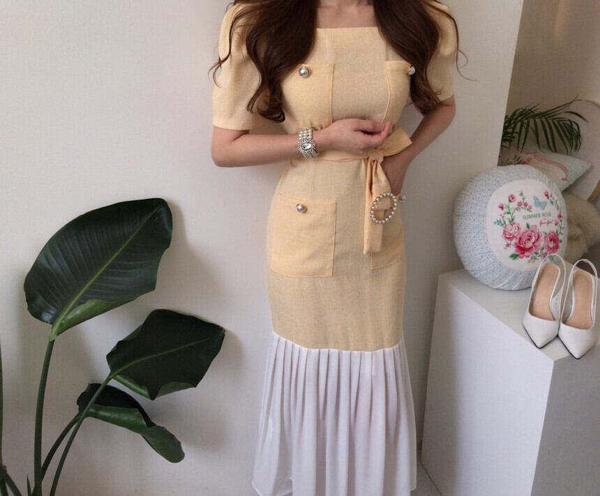 ドレス サマーカラーシフォンロングスカート ベルト 夏物 ハーネス スクウェア ステッチ 韓国婦人44658692871