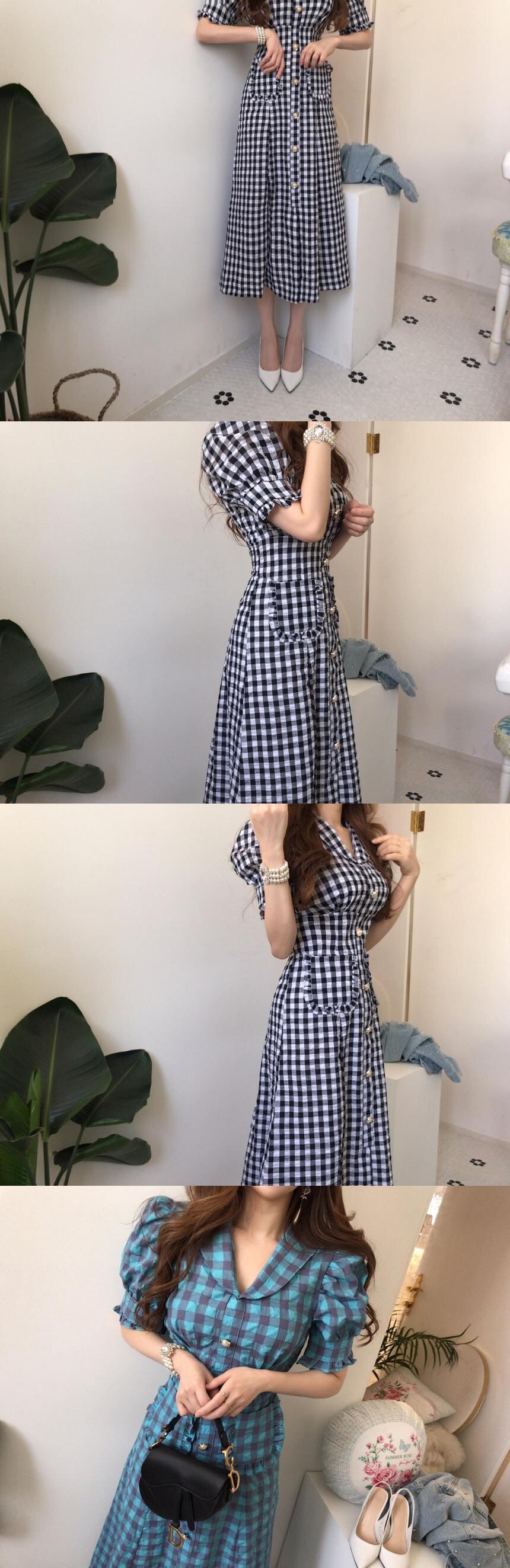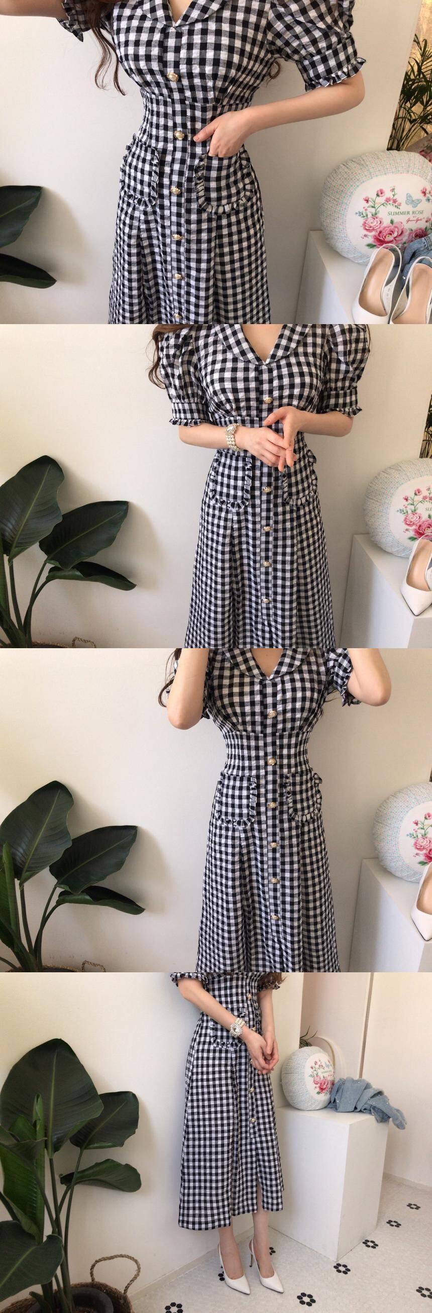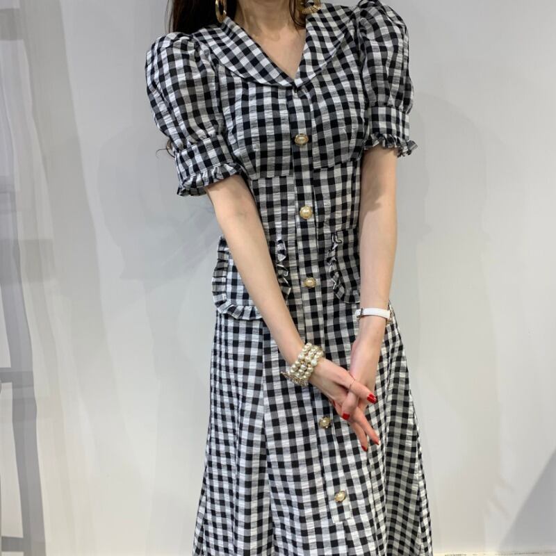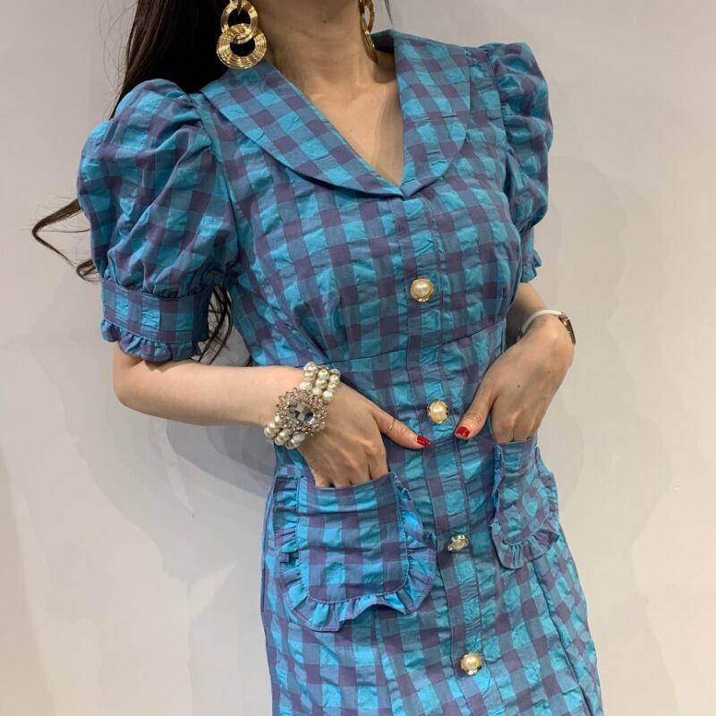 スタンダードカラー格子柄スリーブドレス レトロ 韓国婦人14936447462
