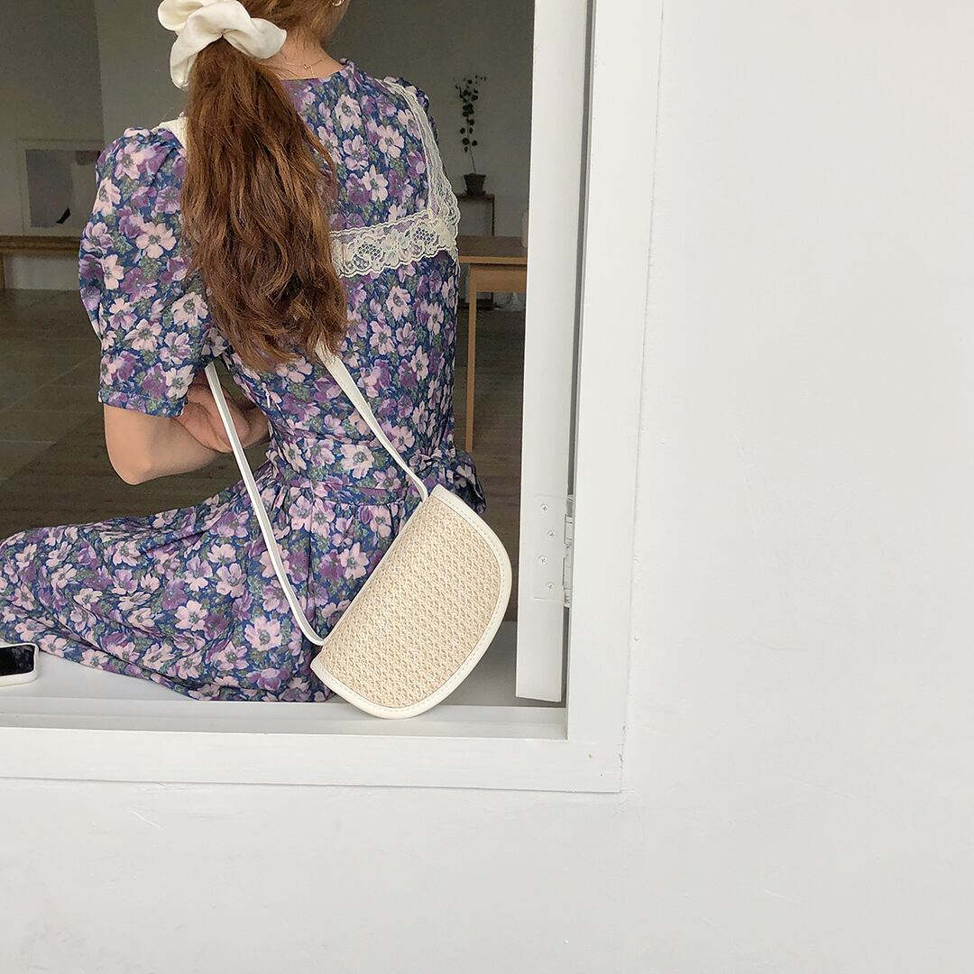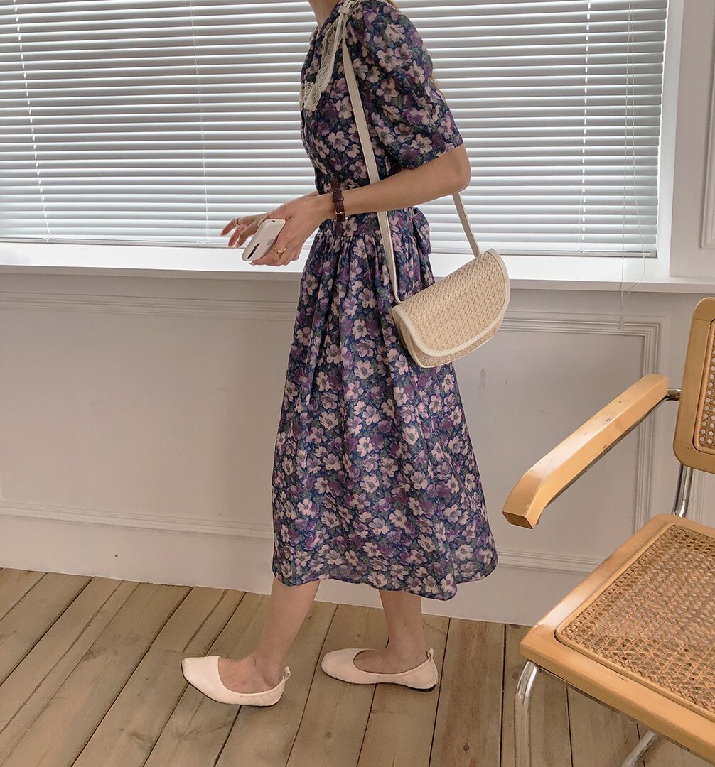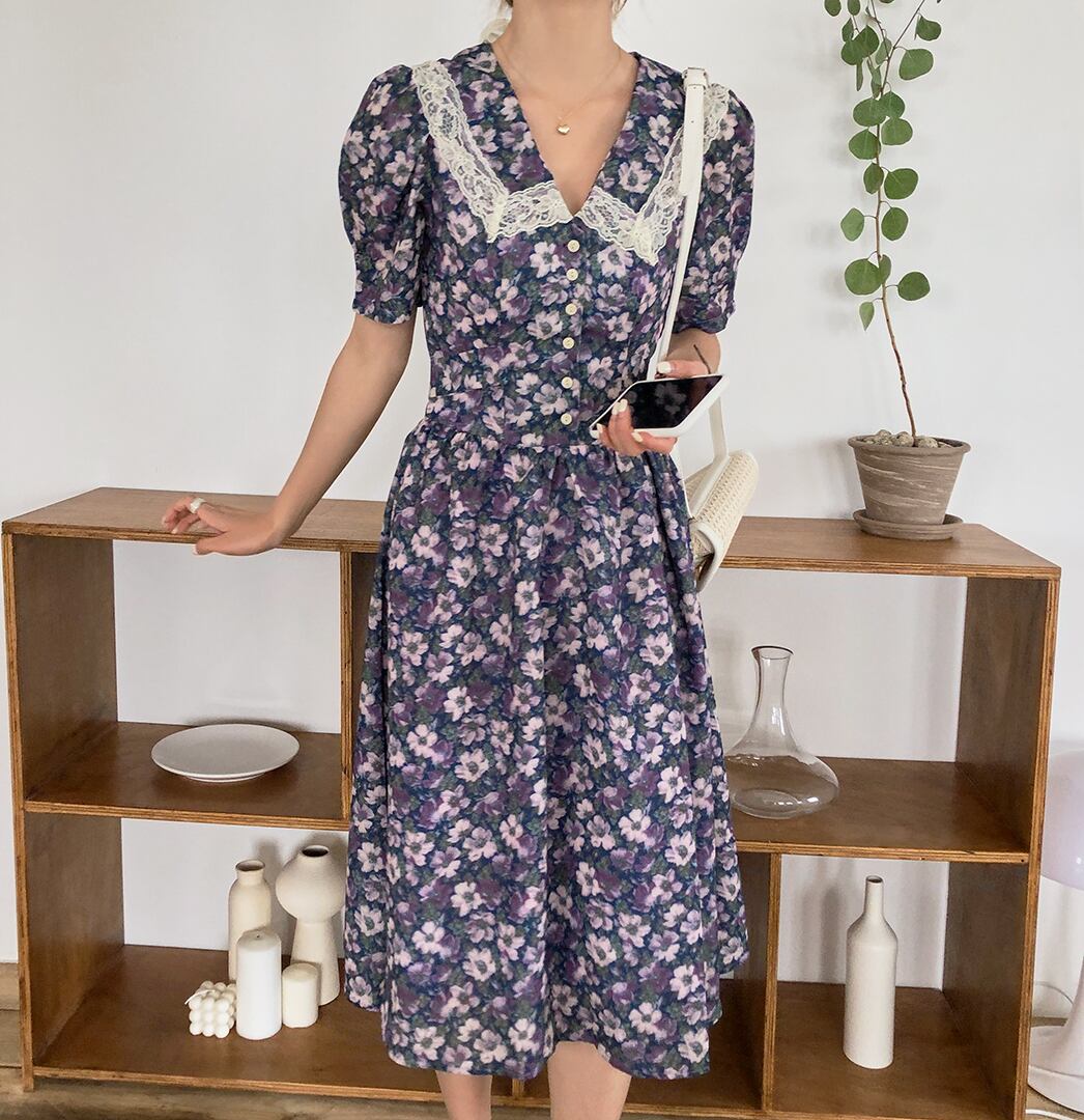 スプリングサマースタンダードレースフローラルドレス ロング薄手ウェストスカート レディース レトロ 春物 夏物 花柄 ステッチ 韓国婦人88032595143