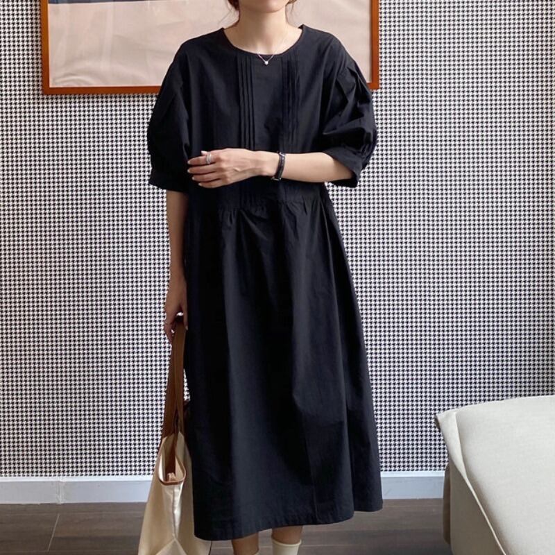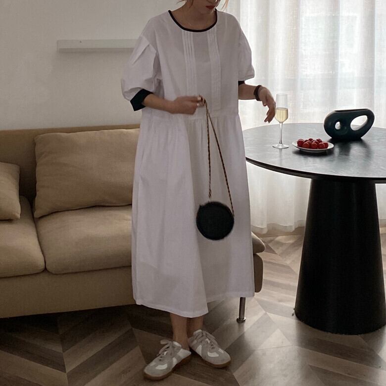 サマースタンダードスタイルカラーラウンドネックルーズホワイトスリーブドレス レトロ 夏物 Oネック 韓国婦人89282056480