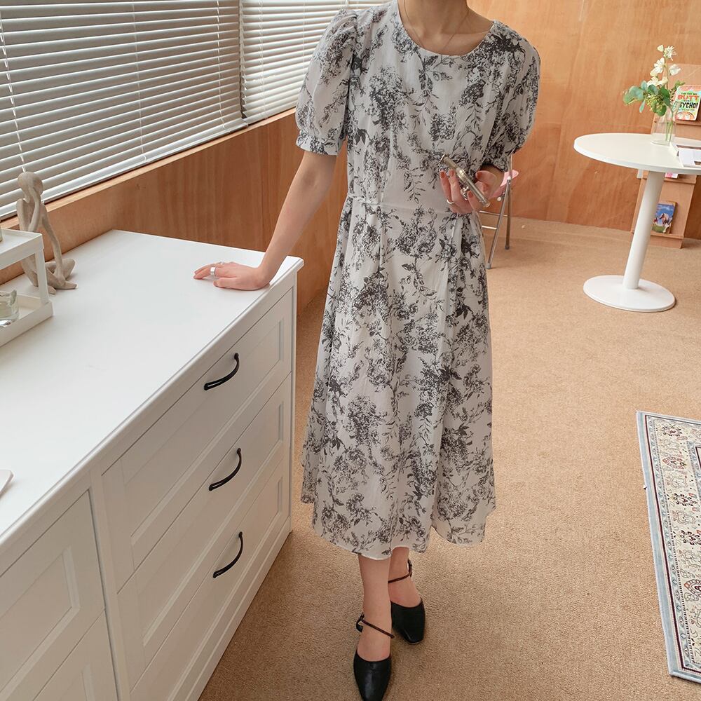 スカート サマースタンダードラウンドネックフローラルドレス ロング レトロ エレガント 夏物 花柄 Oネック 韓国婦人79905246458